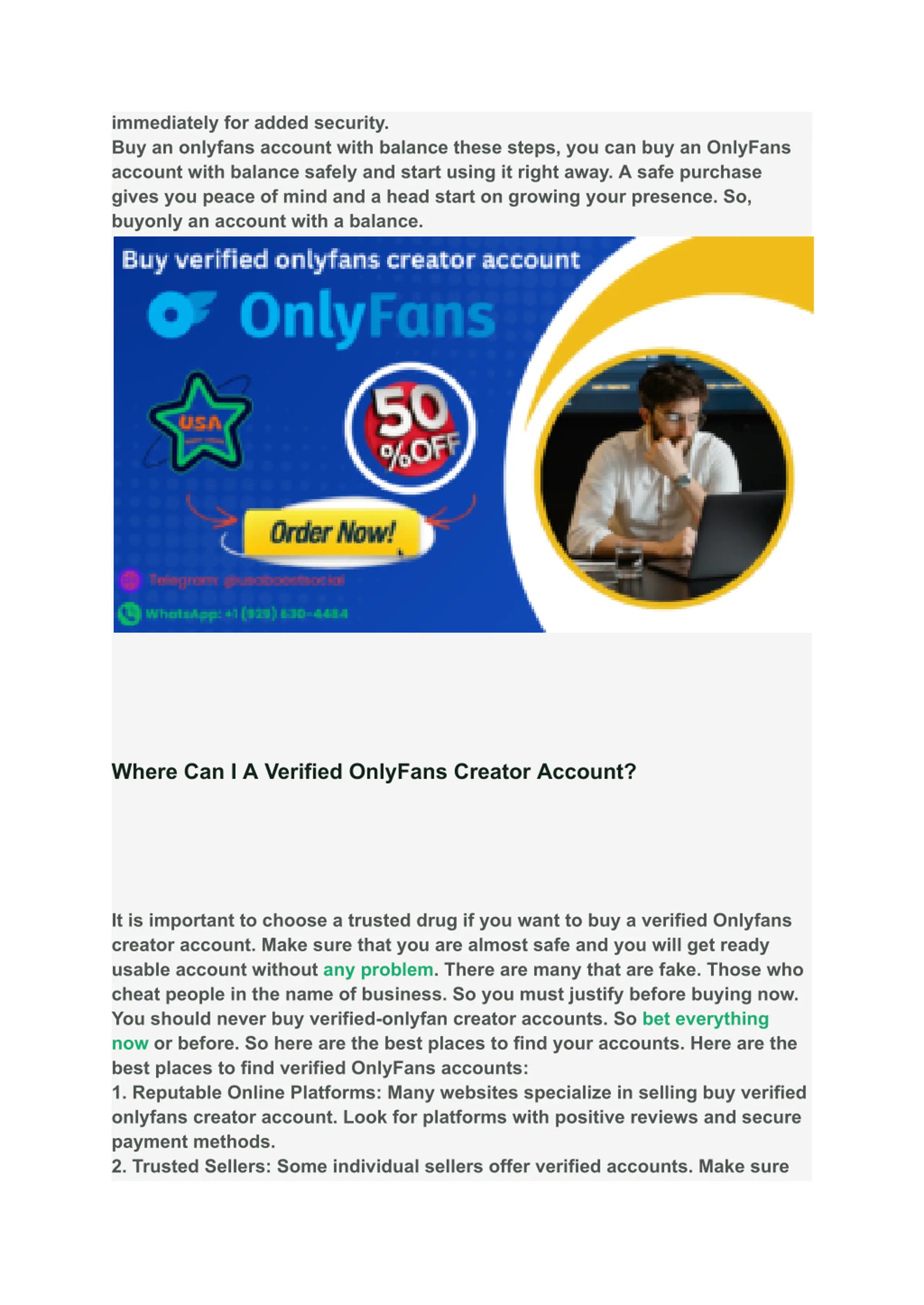 2. Linked email and phone number All active followers You can get feedback from influencers by providing verified people accounts for review. Easy to use, especially for home delivery. Exchange guarantee 24/7 customer support Money back guarantee Please contact 24-hour any time Email: usaboostsocial@gmail.com Telegram: @usaboostsocial Skype: usaboostsocial WhatsApp: +1 (929) 630-4484 https://usaboostsocial.com/product/buy-verified-onlyfans-creator-account/ Importance of Buy Verified OnlyFans Creator Account for Any Online Business In today s online world, having an account on one of these platforms can be a big step for you. It saves time and gives you a huge advantage. Buy verified onlyfans creator account to it, you can take on a huge career. When you buy verified onlyfans creator account theater, you get a ready-to-use account without the hassle of creating a job yourself. This is considered a very important thing for your business. Buy verified onlyfans creator account for instant expertise. And this account builds trust with your followers and potential customers. And by subscribing to all of them, you go through the long verification process and get motivated to create content. Your visibility will increase. Buy verified onlyfans creator account can attract followers and fans, which can help you grow faster. If you use such accounts, you will be considered a professional. It establishes a strong foundation for building a brand and a loyal audience. For many businesses, having a buy verified onlyfans creator account can make a huge difference in reaching your goals.