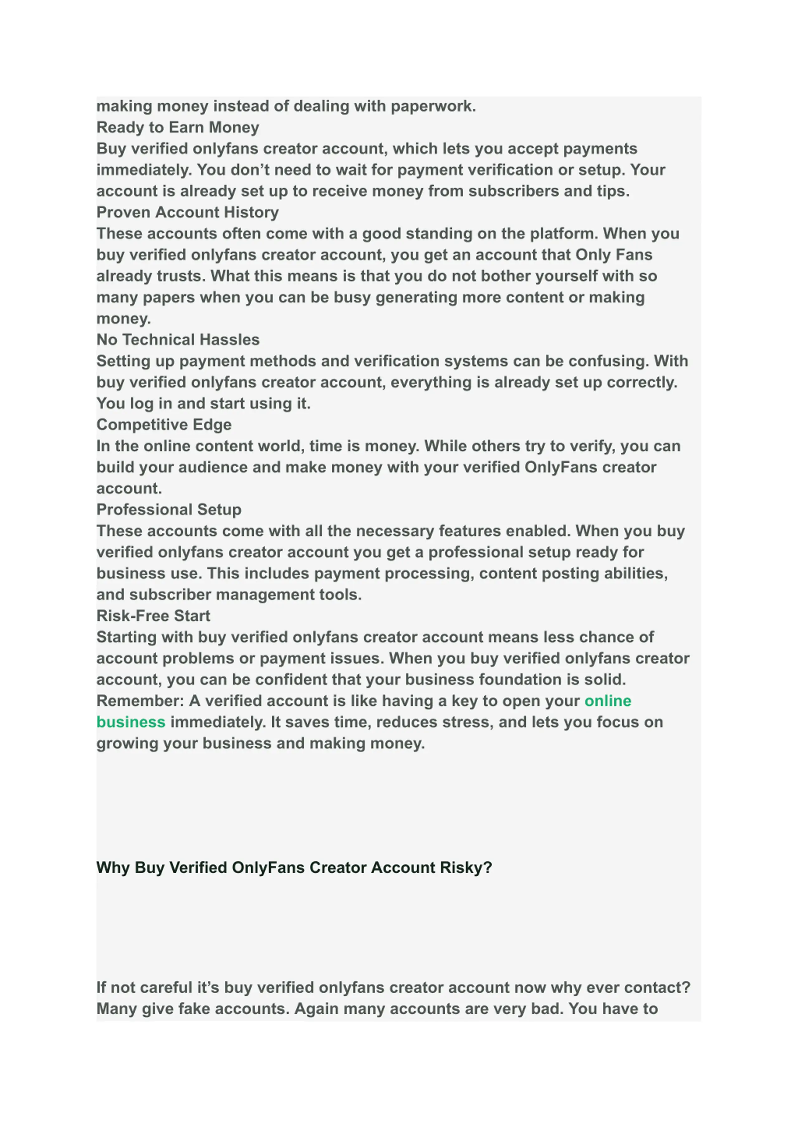 13. making money instead of dealing with paperwork. Ready to Earn Money Buy verified onlyfans creator account, which lets you accept payments immediately. You don t need to wait for payment verification or setup. Your account is already set up to receive money from subscribers and tips. Proven Account History These accounts often come with a good standing on the platform. When you buy verified onlyfans creator account, you get an account that Only Fans already trusts. What this means is that you do not bother yourself with so many papers when you can be busy generating more content or making money. No Technical Hassles Setting up payment methods and verification systems can be confusing. With buy verified onlyfans creator account, everything is already set up correctly. You log in and start using it. Competitive Edge In the online content world, time is money. While others try to verify, you can build your audience and make money with your verified OnlyFans creator account. Professional Setup These accounts come with all the necessary features enabled. When you buy verified onlyfans creator account you get a professional setup ready for business use. This includes payment processing, content posting abilities, and subscriber management tools. Risk-Free Start Starting with buy verified onlyfans creator account means less chance of account problems or payment issues. When you buy verified onlyfans creator account, you can be confident that your business foundation is solid. Remember: A verified account is like having a key to open your online business immediately. It saves time, reduces stress, and lets you focus on growing your business and making money. Why Buy Verified OnlyFans Creator Account Risky? If not careful it s buy verified onlyfans creator account now why ever contact? Many give fake accounts. Again many accounts are very bad. You have to