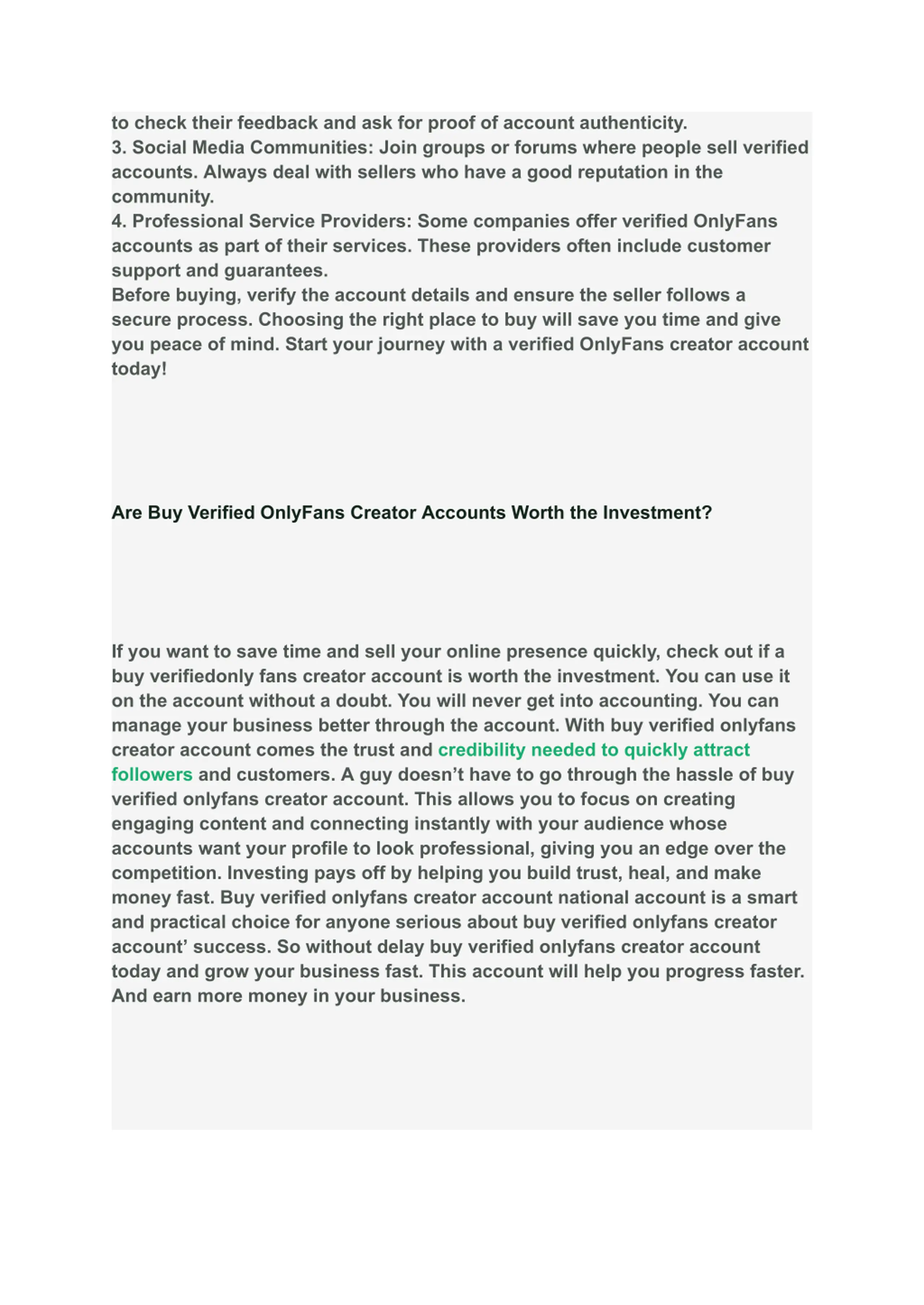 9. to check their feedback and ask for proof of account authenticity. 3. Social Media Communities: Join groups or forums where people sell verified accounts. Always deal with sellers who have a good reputation in the community. 4. Professional Service Providers: Some companies offer verified OnlyFans accounts as part of their services. These providers often include customer support and guarantees. Before buying, verify the account details and ensure the seller follows a secure process. Choosing the right place to buy will save you time and give you peace of mind. Start your journey with a verified OnlyFans creator account today! Are Buy Verified OnlyFans Creator Accounts Worth the Investment? If you want to save time and sell your online presence quickly, check out if a buy verifiedonly fans creator account is worth the investment. You can use it on the account without a doubt. You will never get into accounting. You can manage your business better through the account. With buy verified onlyfans creator account comes the trust and credibility needed to quickly attract followers and customers. A guy doesn t have to go through the hassle of buy verified onlyfans creator account. This allows you to focus on creating engaging content and connecting instantly with your audience whose accounts want your profile to look professional, giving you an edge over the competition. Investing pays off by helping you build trust, heal, and make money fast. Buy verified onlyfans creator account national account is a smart and practical choice for anyone serious about buy verified onlyfans creator account success. So without delay buy verified onlyfans creator account today and grow your business fast. This account will help you progress faster. And earn more money in your business.