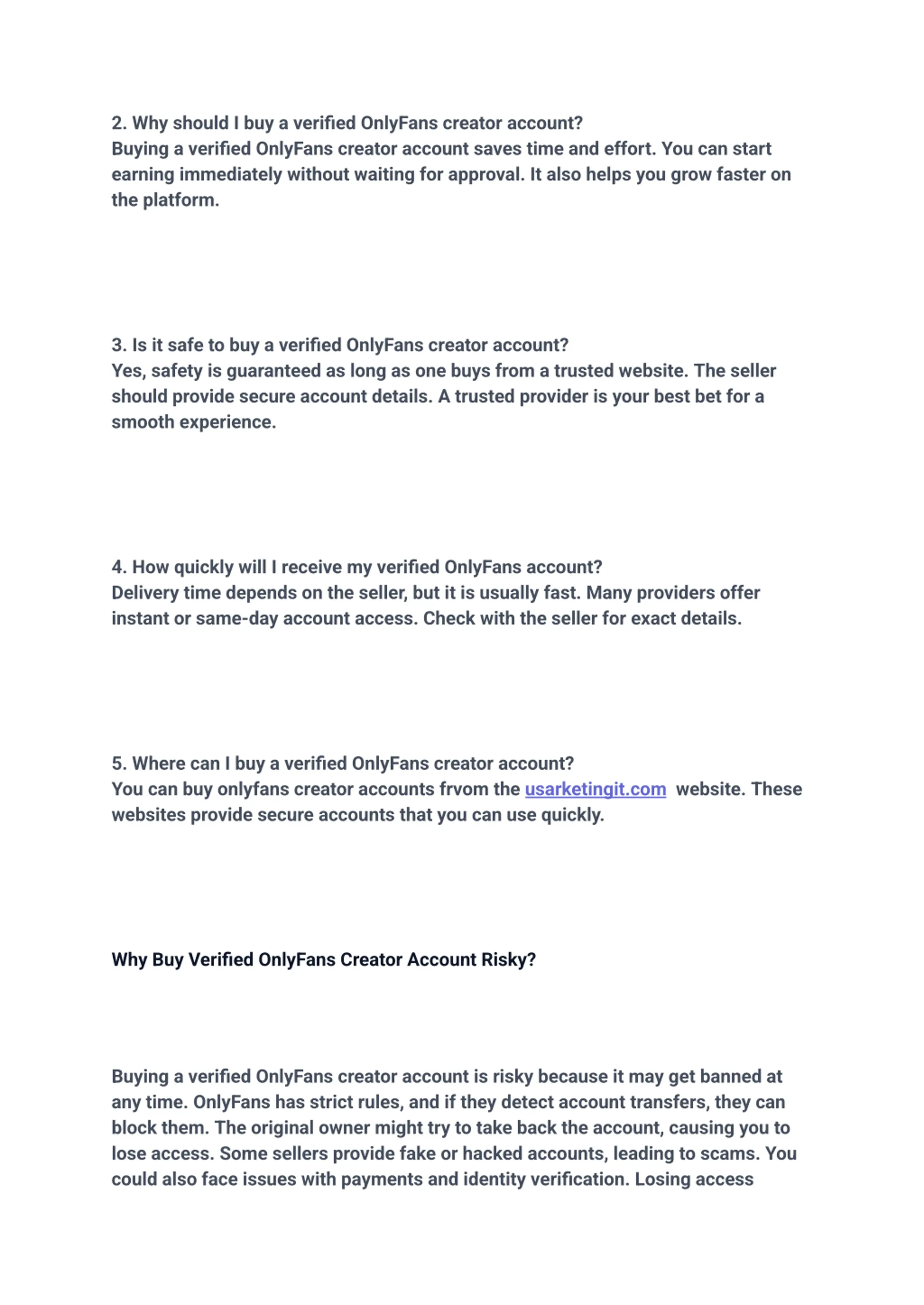 6. 2. Why should I buy a verified OnlyFans creator account? Buying a verified OnlyFans creator account saves time and effort. You can start earning immediately without waiting for approval. It also helps you grow faster on the platform. 3. Is it safe to buy a verified OnlyFans creator account? Yes, safety is guaranteed as long as one buys from a trusted website. The seller should provide secure account details. A trusted provider is your best bet for a smooth experience. 4. How quickly will I receive my verified OnlyFans account? Delivery time depends on the seller, but it is usually fast. Many providers offer instant or same-day account access. Check with the seller for exact details. 5. Where can I buy a verified OnlyFans creator account? You can buy onlyfans creator accounts frvom the usarketingit.com website. These websites provide secure accounts that you can use quickly. Why Buy Verified OnlyFans Creator Account Risky? Buying a verified OnlyFans creator account is risky because it may get banned at any time. OnlyFans has strict rules, and if they detect account transfers, they can block them. The original owner might try to take back the account, causing you to lose access. Some sellers provide fake or hacked accounts, leading to scams. You could also face issues with payments and identity verification. Losing access