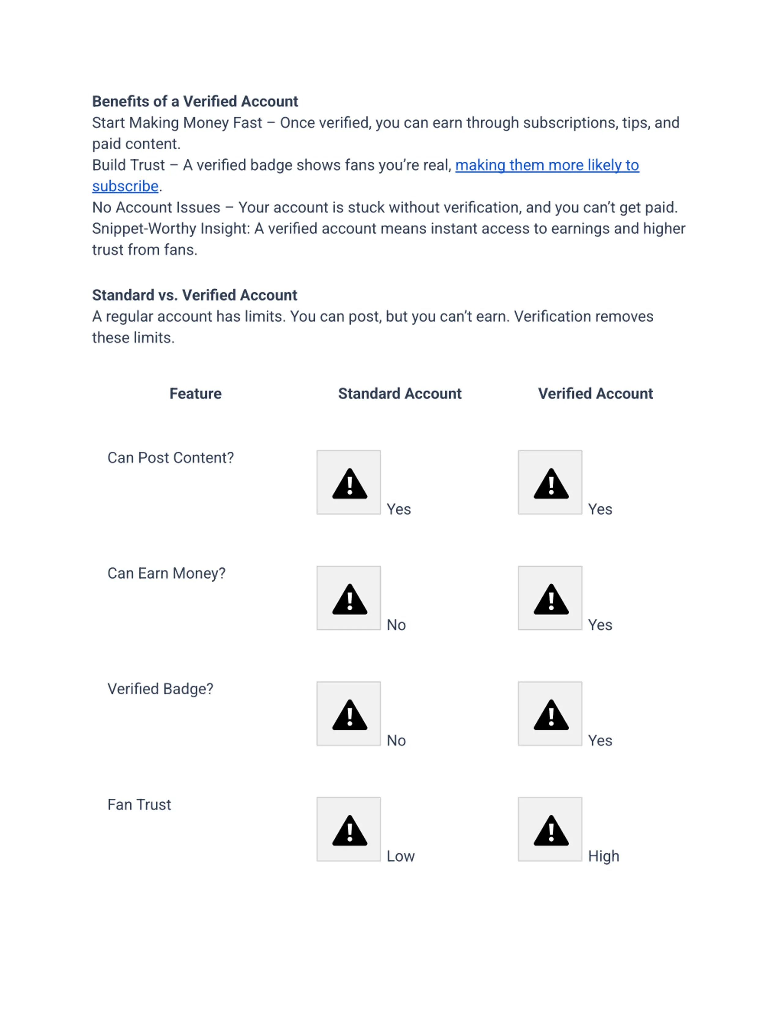Benefits of a Verified Account Start Making Money Fast Once verified, you can earn through subscriptions, tips, and paid content. Build Trust A verified badge shows fans you re real, making them more likely to subscribe. No Account Issues Your account is stuck without verification, and you can t get paid. Snippet-Worthy Insight: A verified account means instant access to earnings and higher trust from fans. Standard vs. Verified Account A regular account has limits. You can post, but you can t earn. Verification removes these limits. Feature Standard Account Verified Account Can Post Content? Yes Yes Can Earn Money? No Yes Verified Badge? No Yes Fan Trust Low High