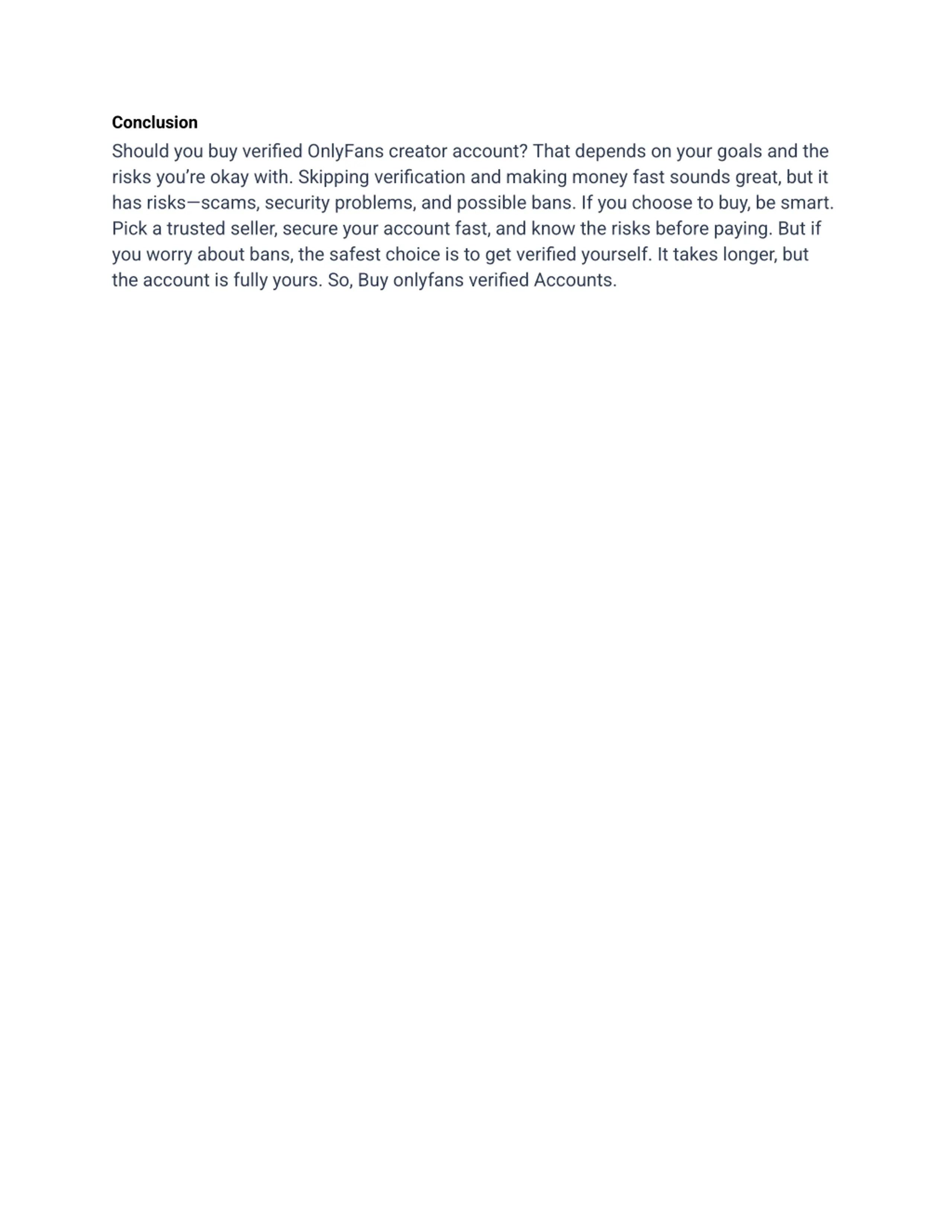 Conclusion Should you buy verified OnlyFans creator account? That depends on your goals and the risks you re okay with. Skipping verification and making money fast sounds great, but it has risks scams, security problems, and possible bans. If you choose to buy, be smart. Pick a trusted seller, secure your account fast, and know the risks before paying. But if you worry about bans, the safest choice is to get verified yourself. It takes longer, but the account is fully yours. So, Buy onlyfans verified Accounts.