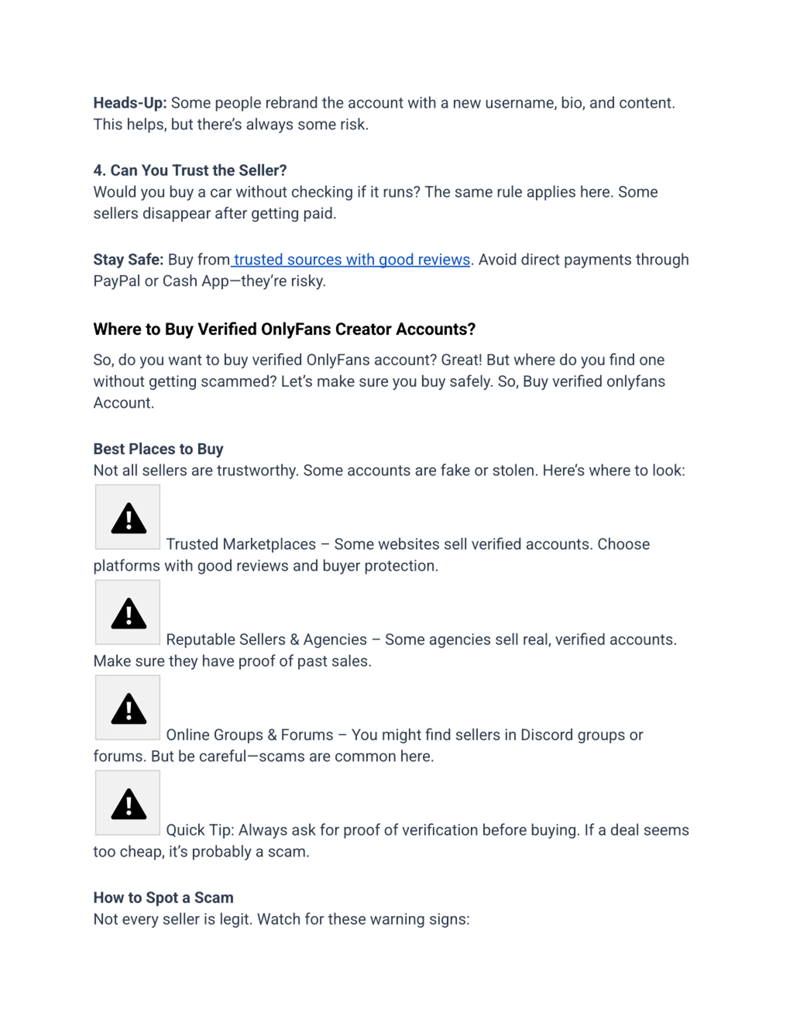 Heads-Up: Some people rebrand the account with a new username, bio, and content. This helps, but there s always some risk. 4. Can You Trust the Seller? Would you buy a car without checking if it runs? The same rule applies here. Some sellers disappear after getting paid. Stay Safe: Buy from trusted sources with good reviews. Avoid direct payments through PayPal or Cash App they re risky. Where to Buy Verified OnlyFans Creator Accounts? So, do you want to buy verified OnlyFans account? Great! But where do you find one without getting scammed? Let s make sure you buy safely. So, Buy verified onlyfans Account. Best Places to Buy Not all sellers are trustworthy. Some accounts are fake or stolen. Here s where to look: Trusted Marketplaces Some websites sell verified accounts. Choose platforms with good reviews and buyer protection. Reputable Sellers & Agencies Some agencies sell real, verified accounts. Make sure they have proof of past sales. Online Groups & Forums You might find sellers in Discord groups or forums. But be careful scams are common here. Quick Tip: Always ask for proof of verification before buying. If a deal seems too cheap, it s probably a scam. How to Spot a Scam Not every seller is legit. Watch for these warning signs: