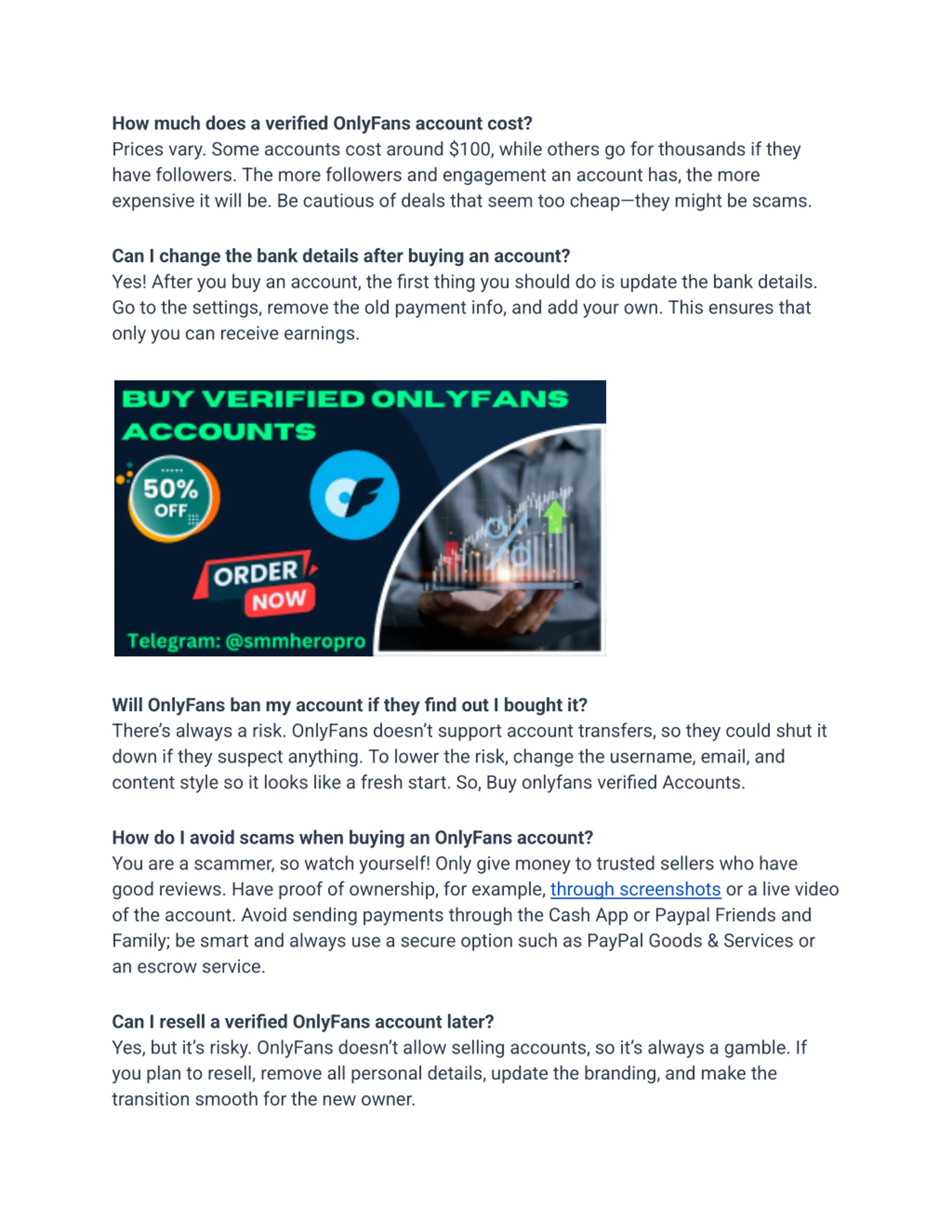How much does a verified OnlyFans account cost? Prices vary. Some accounts cost around $100, while others go for thousands if they have followers. The more followers and engagement an account has, the more expensive it will be. Be cautious of deals that seem too cheap they might be scams. Can I change the bank details after buying an account? Yes! After you buy an account, the first thing you should do is update the bank details. Go to the settings, remove the old payment info, and add your own. This ensures that only you can receive earnings. Will OnlyFans ban my account if they find out I bought it? There s always a risk. OnlyFans doesn t support account transfers, so they could shut it down if they suspect anything. To lower the risk, change the username, email, and content style so it looks like a fresh start. So, Buy onlyfans verified Accounts. How do I avoid scams when buying an OnlyFans account? You are a scammer, so watch yourself! Only give money to trusted sellers who have good reviews. Have proof of ownership, for example, through screenshots or a live video of the account. Avoid sending payments through the Cash App or Paypal Friends and Family; be smart and always use a secure option such as PayPal Goods & Services or an escrow service. Can I resell a verified OnlyFans account later? Yes, but it s risky. OnlyFans doesn t allow selling accounts, so it s always a gamble. If you plan to resell, remove all personal details, update the branding, and make the transition smooth for the new owner.