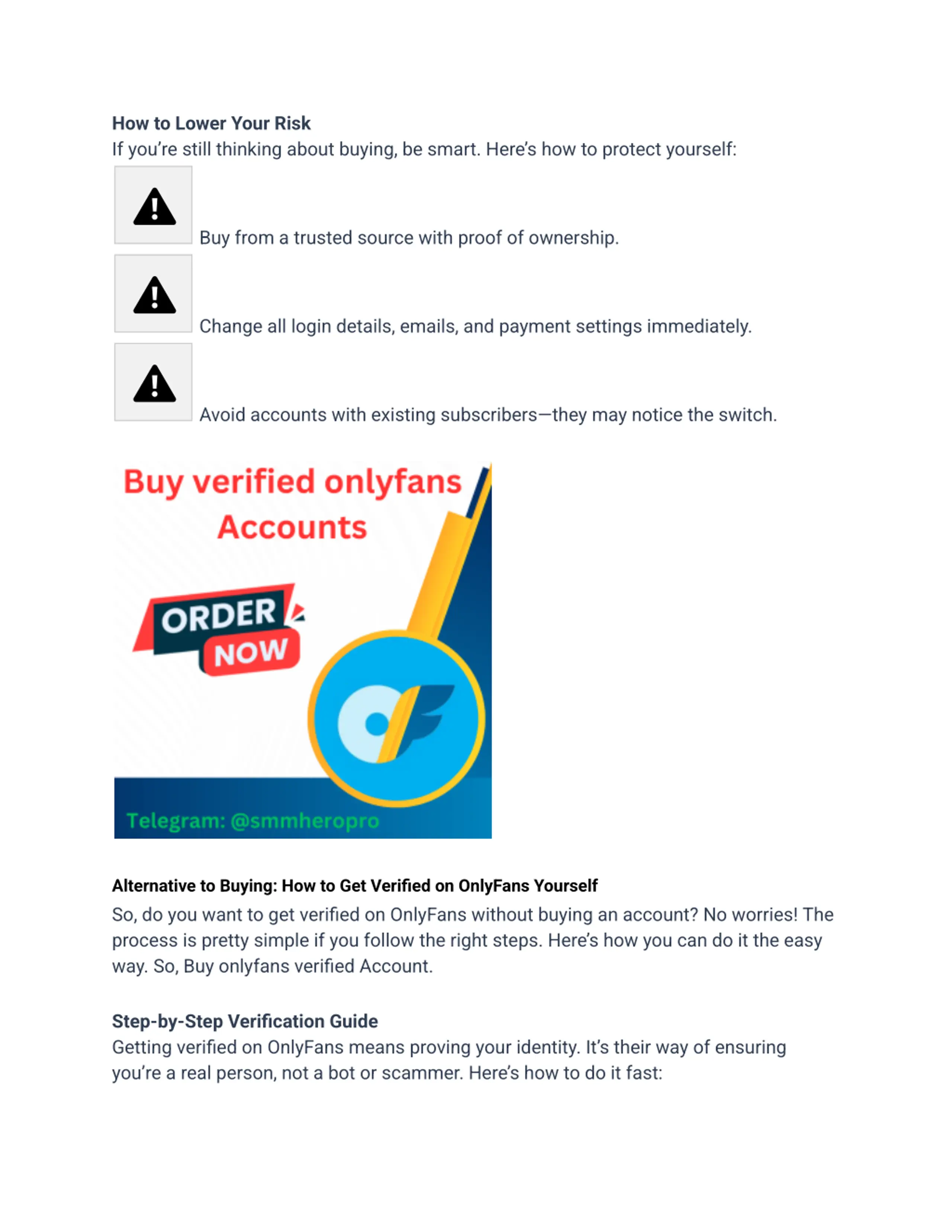 How to Lower Your Risk If you re still thinking about buying, be smart. Here s how to protect yourself: Buy from a trusted source with proof of ownership. Change all login details, emails, and payment settings immediately. Avoid accounts with existing subscribers they may notice the switch. Alternative to Buying: How to Get Verified on OnlyFans Yourself So, do you want to get verified on OnlyFans without buying an account? No worries! The process is pretty simple if you follow the right steps. Here s how you can do it the easy way. So, Buy onlyfans verified Account. Step-by-Step Verification Guide Getting verified on OnlyFans means proving your identity. It s their way of ensuring you re a real person, not a bot or scammer. Here s how to do it fast: