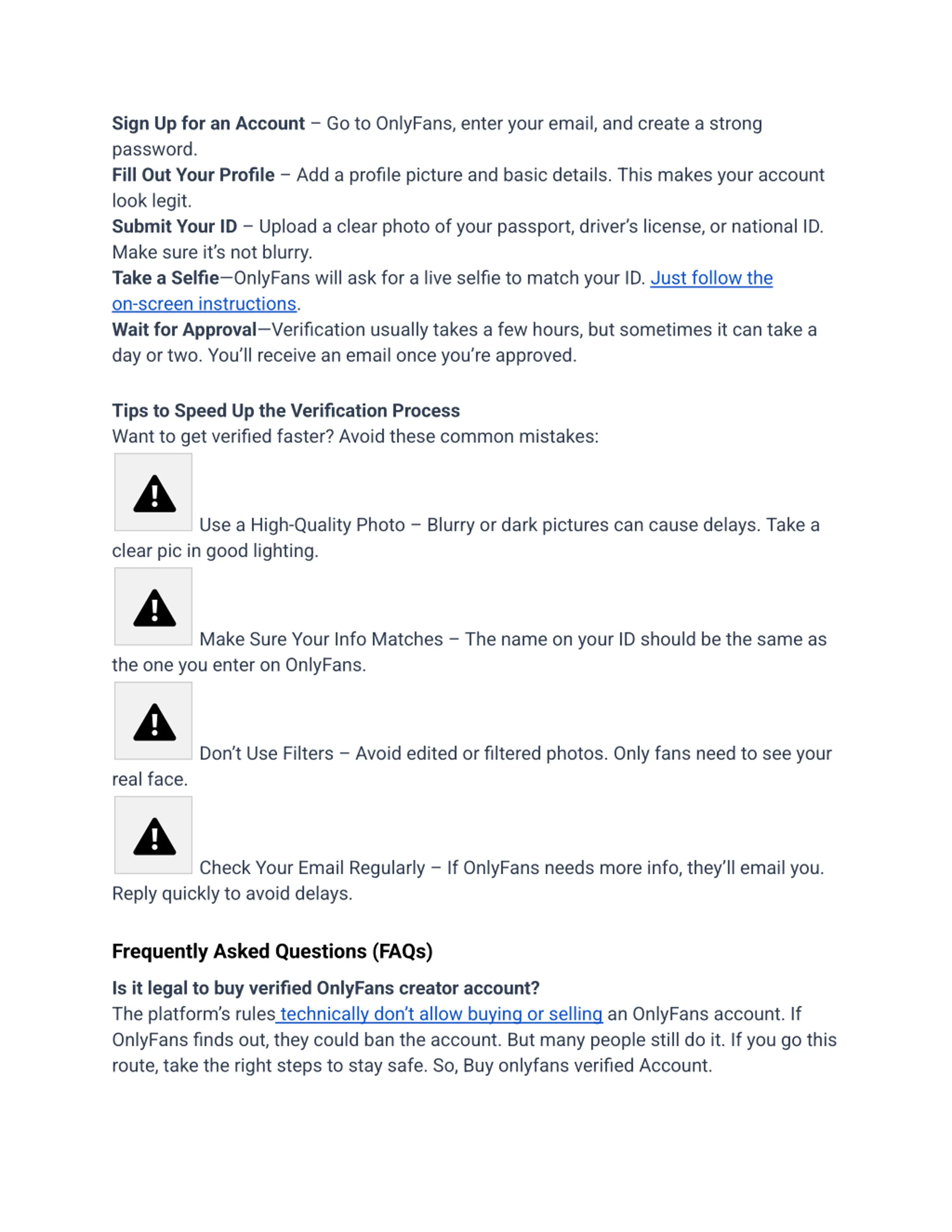 Sign Up for an Account Go to OnlyFans, enter your email, and create a strong password. Fill Out Your Profile Add a profile picture and basic details. This makes your account look legit. Submit Your ID Upload a clear photo of your passport, driver s license, or national ID. Make sure it s not blurry. Take a Selfie OnlyFans will ask for a live selfie to match your ID. Just follow the on-screen instructions. Wait for Approval Verification usually takes a few hours, but sometimes it can take a day or two. You ll receive an email once you re approved. Tips to Speed Up the Verification Process Want to get verified faster? Avoid these common mistakes: Use a High-Quality Photo Blurry or dark pictures can cause delays. Take a clear pic in good lighting. Make Sure Your Info Matches The name on your ID should be the same as the one you enter on OnlyFans. Don t Use Filters Avoid edited or filtered photos. Only fans need to see your real face. Check Your Email Regularly If OnlyFans needs more info, they ll email you. Reply quickly to avoid delays. Frequently Asked Questions (FAQs) Is it legal to buy verified OnlyFans creator account? The platform s rules technically don t allow buying or selling an OnlyFans account. If OnlyFans finds out, they could ban the account. But many people still do it. If you go this route, take the right steps to stay safe. So, Buy onlyfans verified Account.