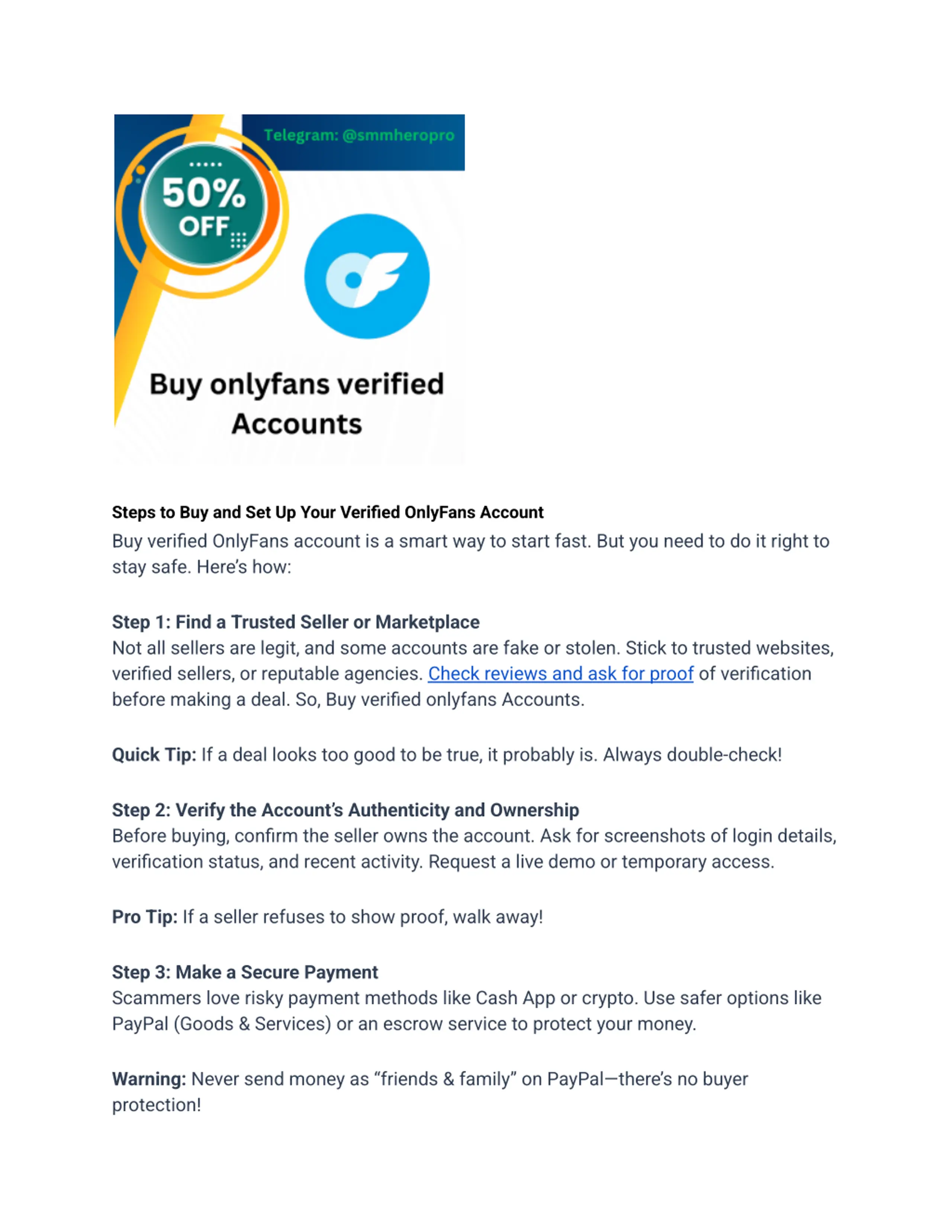 Steps to Buy and Set Up Your Verified OnlyFans Account Buy verified OnlyFans account is a smart way to start fast. But you need to do it right to stay safe. Here s how: Step 1: Find a Trusted Seller or Marketplace Not all sellers are legit, and some accounts are fake or stolen. Stick to trusted websites, verified sellers, or reputable agencies. Check reviews and ask for proof of verification before making a deal. So, Buy verified onlyfans Accounts. Quick Tip: If a deal looks too good to be true, it probably is. Always double-check! Step 2: Verify the Account s Authenticity and Ownership Before buying, confirm the seller owns the account. Ask for screenshots of login details, verification status, and recent activity. Request a live demo or temporary access. Pro Tip: If a seller refuses to show proof, walk away! Step 3: Make a Secure Payment Scammers love risky payment methods like Cash App or crypto. Use safer options like PayPal (Goods & Services) or an escrow service to protect your money. Warning: Never send money as friends & family on PayPal there s no buyer protection!