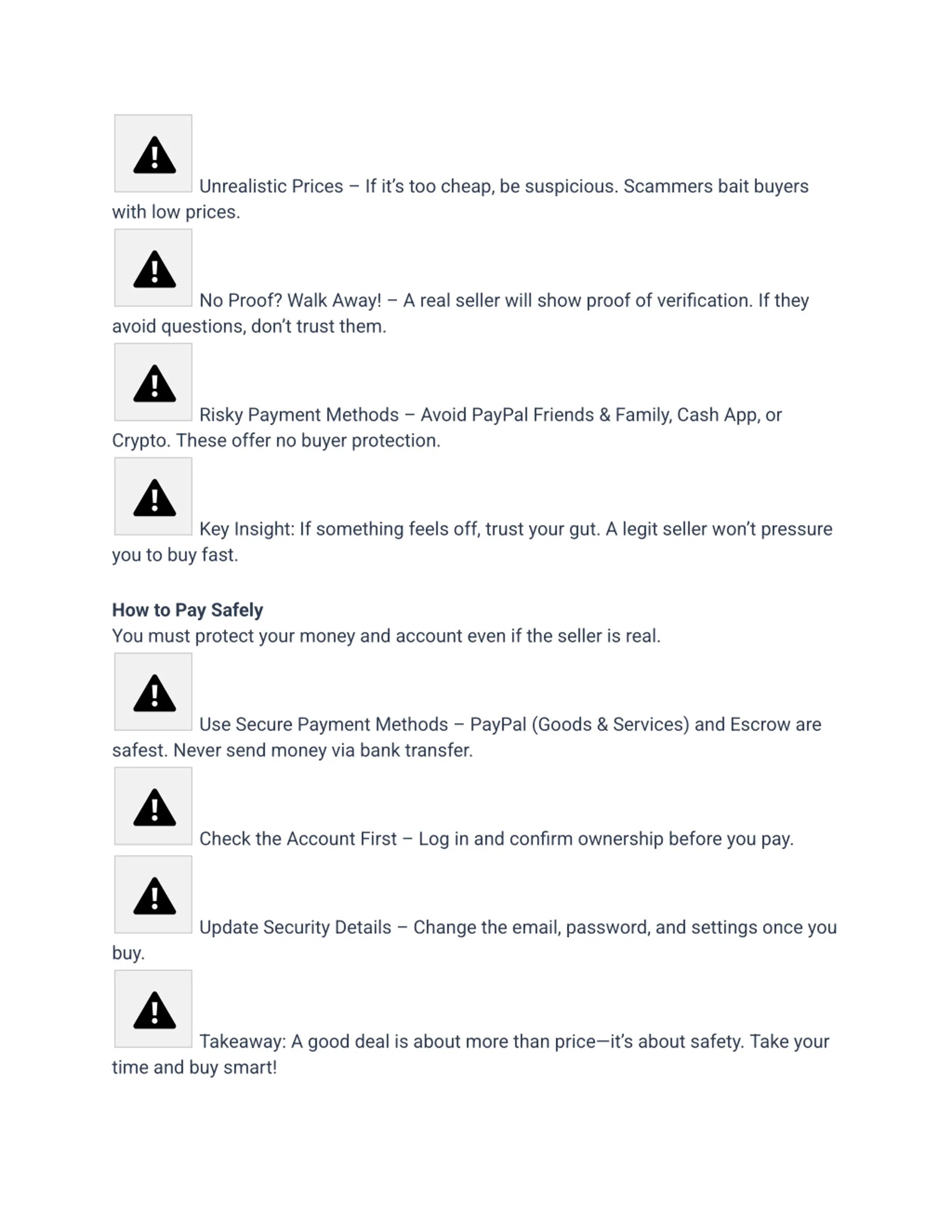 Unrealistic Prices If its too cheap, be suspicious. Scammers bait buyers with low prices. No Proof? Walk Away! A real seller will show proof of verification. If they avoid questions, don t trust them. Risky Payment Methods Avoid PayPal Friends & Family, Cash App, or Crypto. These offer no buyer protection. Key Insight: If something feels off, trust your gut. A legit seller won t pressure you to buy fast. How to Pay Safely You must protect your money and account even if the seller is real. Use Secure Payment Methods PayPal (Goods & Services) and Escrow are safest. Never send money via bank transfer. Check the Account First Log in and confirm ownership before you pay. Update Security Details Change the email, password, and settings once you buy. Takeaway: A good deal is about more than price it s about safety. Take your time and buy smart!