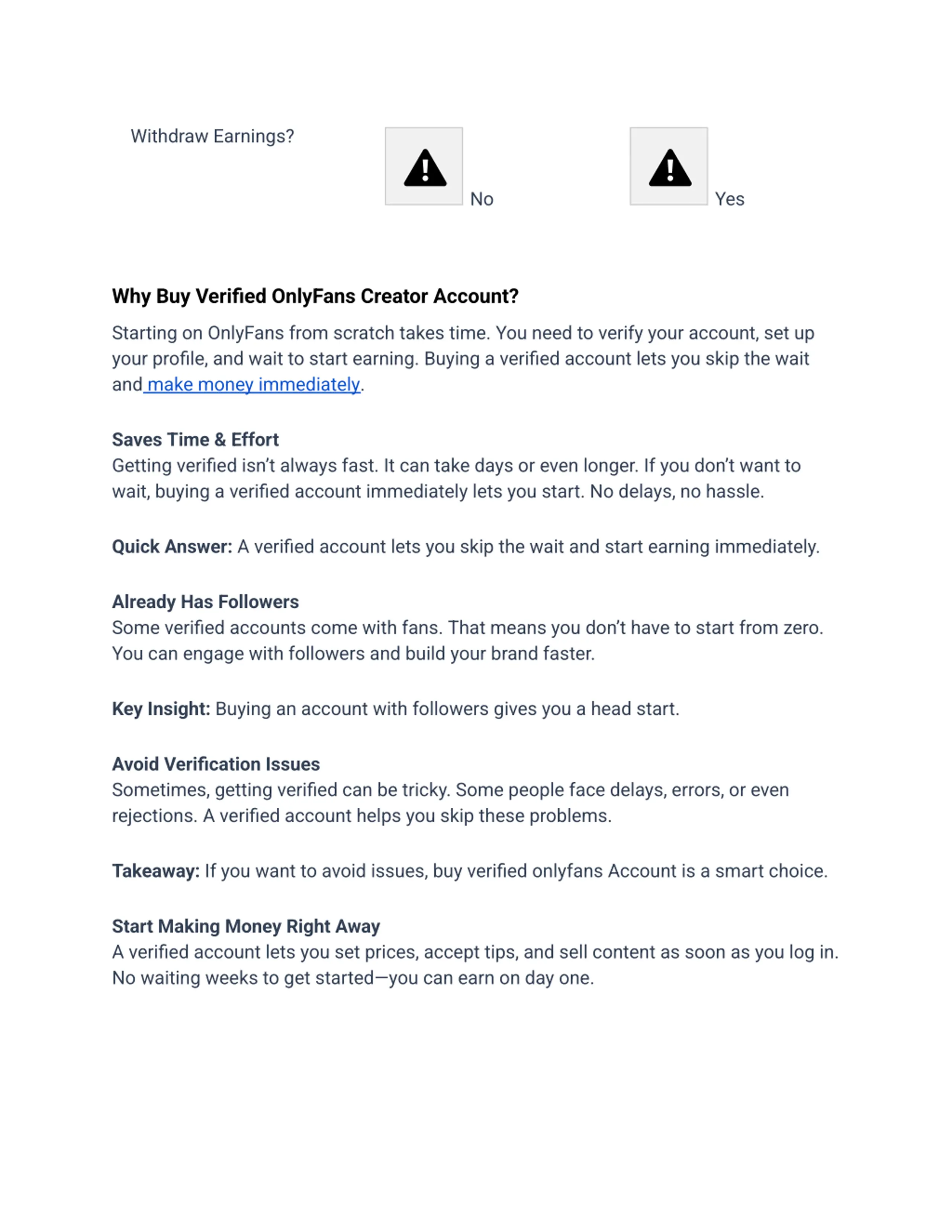 Withdraw Earnings? No Yes Why Buy Verified OnlyFans Creator Account? Starting on OnlyFans from scratch takes time. You need to verify your account, set up your profile, and wait to start earning. Buying a verified account lets you skip the wait and make money immediately. Saves Time & Effort Getting verified isn t always fast. It can take days or even longer. If you don t want to wait, buying a verified account immediately lets you start. No delays, no hassle. Quick Answer: A verified account lets you skip the wait and start earning immediately. Already Has Followers Some verified accounts come with fans. That means you don t have to start from zero. You can engage with followers and build your brand faster. Key Insight: Buying an account with followers gives you a head start. Avoid Verification Issues Sometimes, getting verified can be tricky. Some people face delays, errors, or even rejections. A verified account helps you skip these problems. Takeaway: If you want to avoid issues, buy verified onlyfans Account is a smart choice. Start Making Money Right Away A verified account lets you set prices, accept tips, and sell content as soon as you log in. No waiting weeks to get started you can earn on day one.