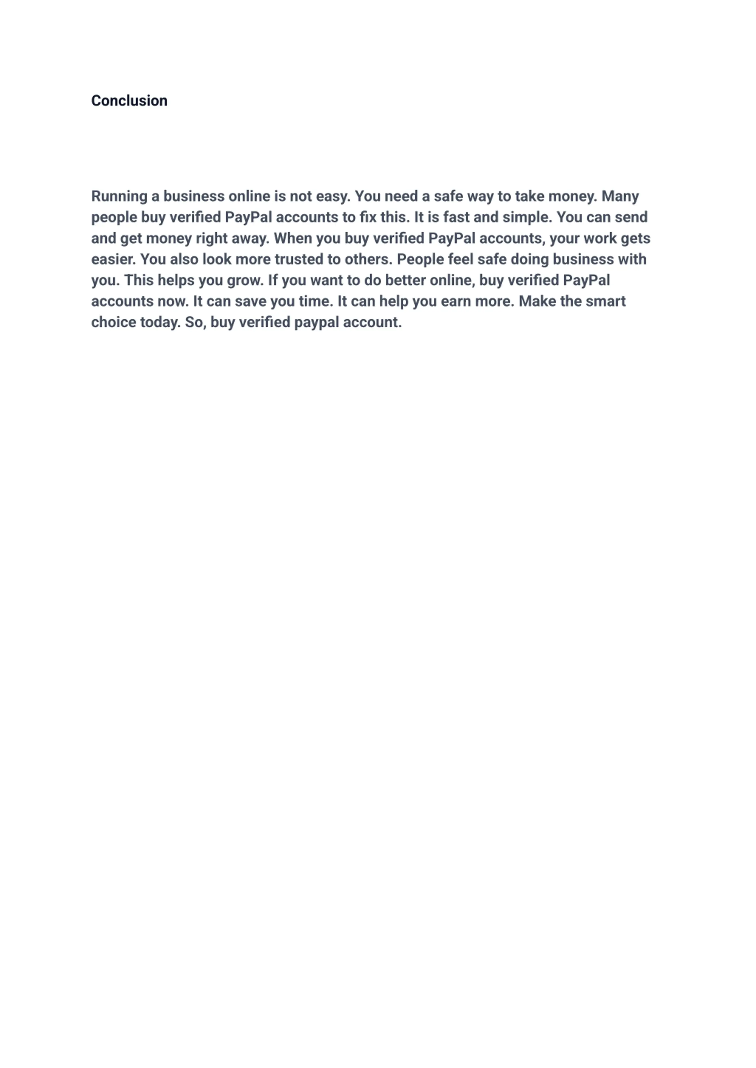 Conclusion Running a business online is not easy. You need a safe way to take money. Many people buy verified PayPal accounts to fix this. It is fast and simple. You can send and get money right away. When you buy verified PayPal accounts, your work gets easier. You also look more trusted to others. People feel safe doing business with you. This helps you grow. If you want to do better online, buy verified PayPal accounts now. It can save you time. It can help you earn more. Make the smart choice today. So, buy verified paypal account.