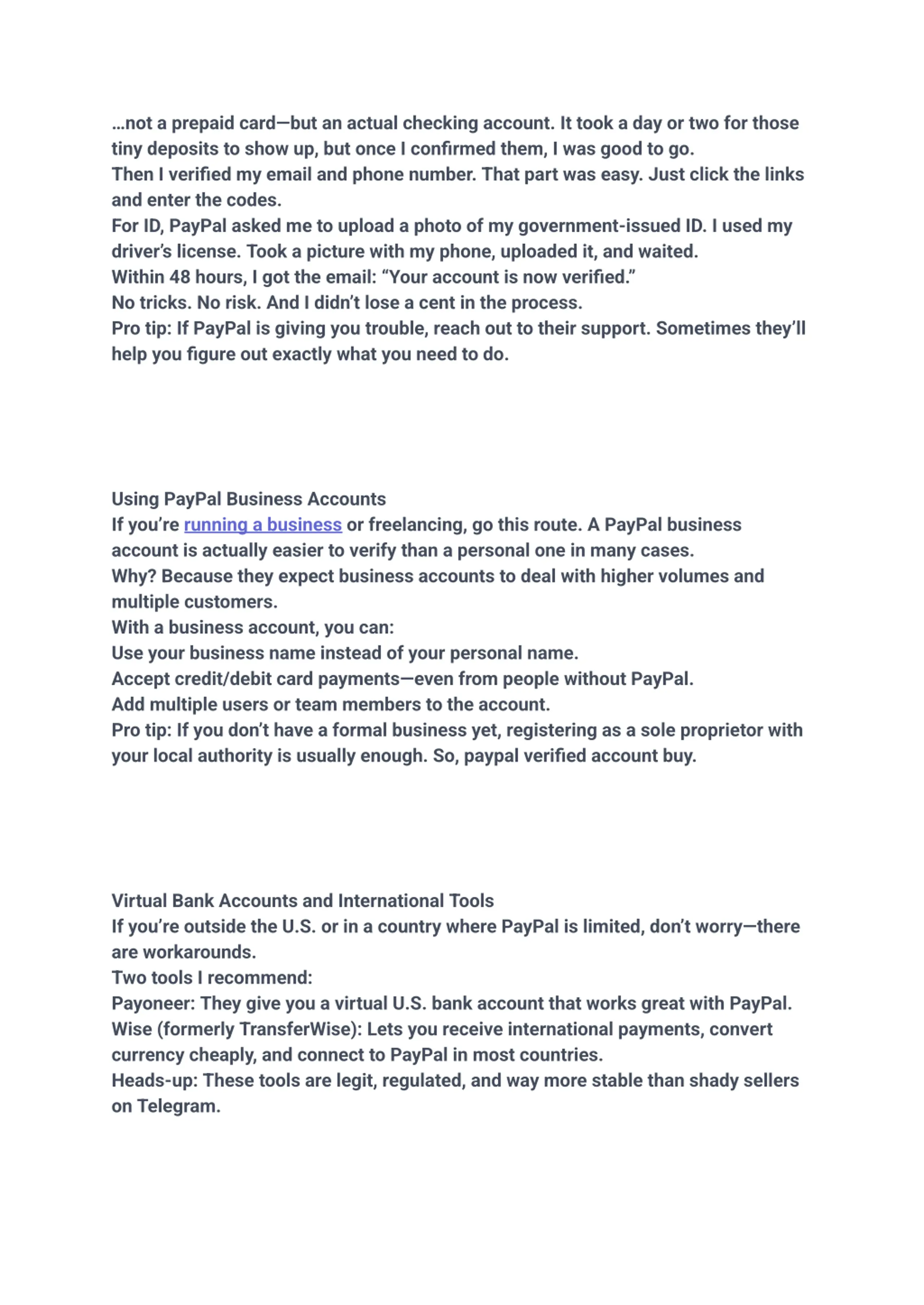 not a prepaid cardbut an actual checking account. It took a day or two for those tiny deposits to show up, but once I confirmed them, I was good to go. Then I verified my email and phone number. That part was easy. Just click the links and enter the codes. For ID, PayPal asked me to upload a photo of my government-issued ID. I used my driver s license. Took a picture with my phone, uploaded it, and waited. Within 48 hours, I got the email: Your account is now verified. No tricks. No risk. And I didn t lose a cent in the process. Pro tip: If PayPal is giving you trouble, reach out to their support. Sometimes they ll help you figure out exactly what you need to do. Using PayPal Business Accounts If you re running a business or freelancing, go this route. A PayPal business account is actually easier to verify than a personal one in many cases. Why? Because they expect business accounts to deal with higher volumes and multiple customers. With a business account, you can: Use your business name instead of your personal name. Accept credit/debit card payments even from people without PayPal. Add multiple users or team members to the account. Pro tip: If you don t have a formal business yet, registering as a sole proprietor with your local authority is usually enough. So, paypal verified account buy. Virtual Bank Accounts and International Tools If you re outside the U.S. or in a country where PayPal is limited, don t worry there are workarounds. Two tools I recommend: Payoneer: They give you a virtual U.S. bank account that works great with PayPal. Wise (formerly TransferWise): Lets you receive international payments, convert currency cheaply, and connect to PayPal in most countries. Heads-up: These tools are legit, regulated, and way more stable than shady sellers on Telegram.
