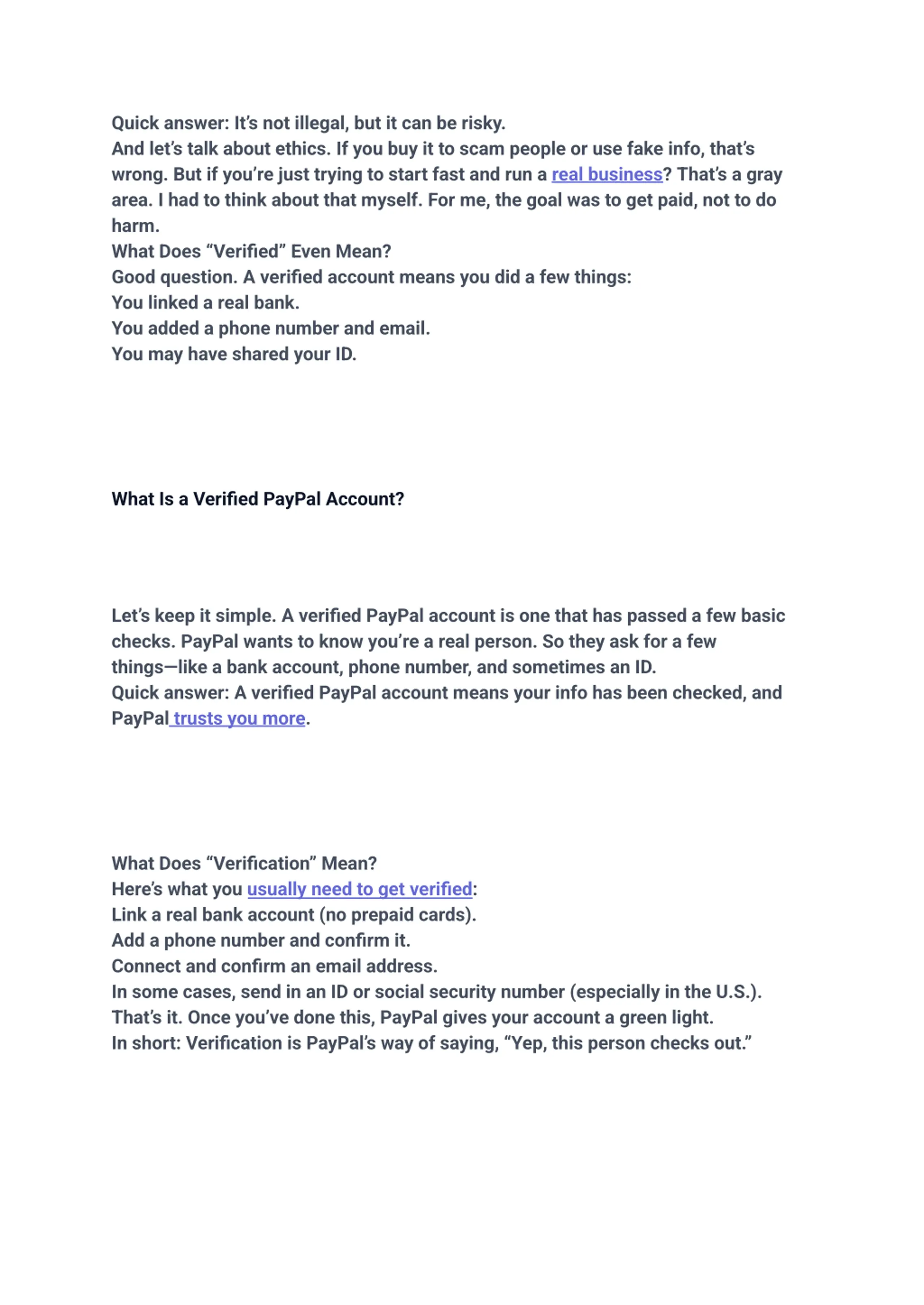 Quick answer: Its not illegal, but it can be risky. And let s talk about ethics. If you buy it to scam people or use fake info, that s wrong. But if you re just trying to start fast and run a real business? That s a gray area. I had to think about that myself. For me, the goal was to get paid, not to do harm. What Does Verified Even Mean? Good question. A verified account means you did a few things: You linked a real bank. You added a phone number and email. You may have shared your ID. What Is a Verified PayPal Account? Let s keep it simple. A verified PayPal account is one that has passed a few basic checks. PayPal wants to know you re a real person. So they ask for a few things like a bank account, phone number, and sometimes an ID. Quick answer: A verified PayPal account means your info has been checked, and PayPal trusts you more. What Does Verification Mean? Here s what you usually need to get verified: Link a real bank account (no prepaid cards). Add a phone number and confirm it. Connect and confirm an email address. In some cases, send in an ID or social security number (especially in the U.S.). That s it. Once you ve done this, PayPal gives your account a green light. In short: Verification is PayPal s way of saying, Yep, this person checks out.