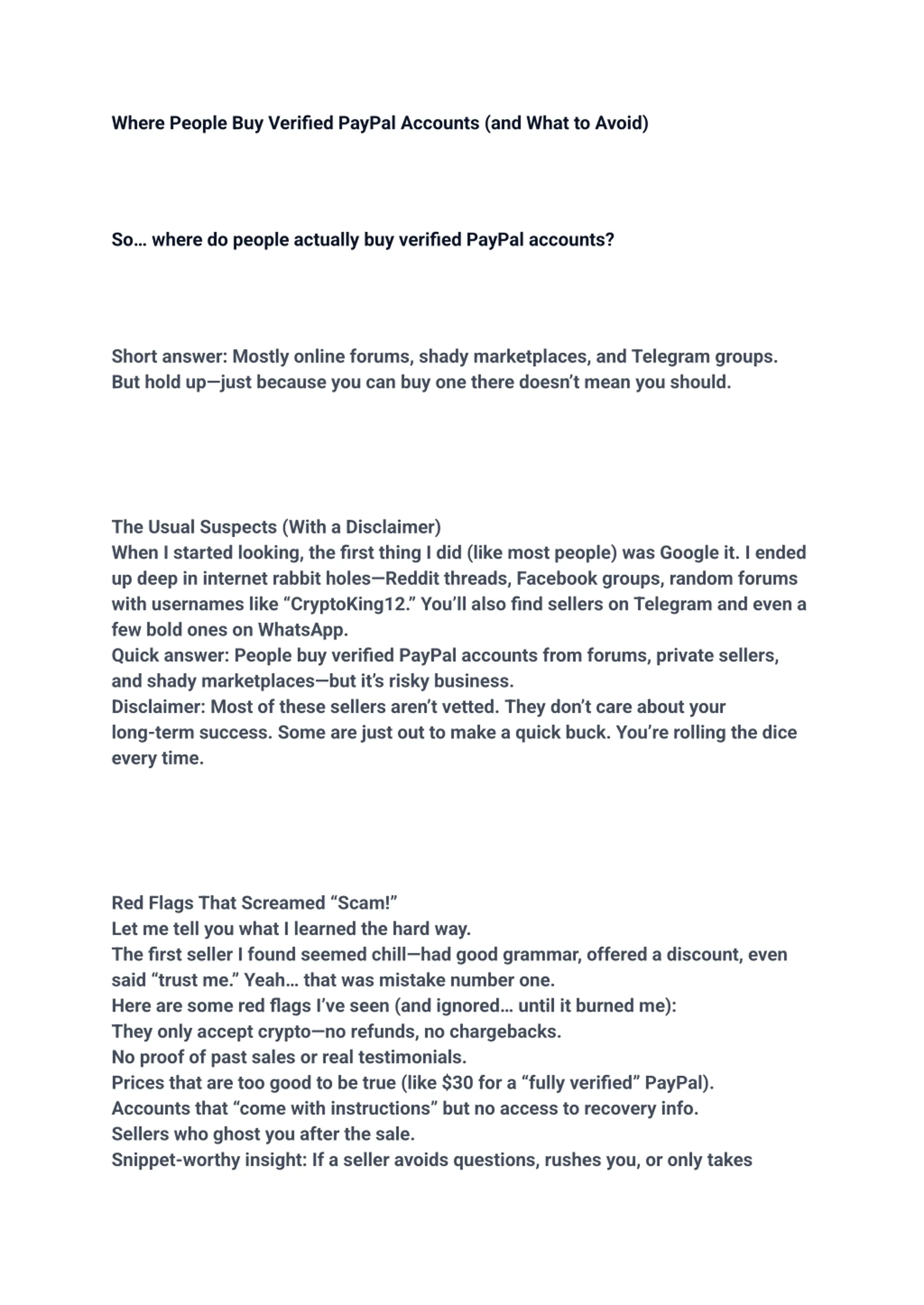 Where People Buy Verified PayPal Accounts (and What to Avoid) So where do people actually buy verified PayPal accounts? Short answer: Mostly online forums, shady marketplaces, and Telegram groups. But hold up just because you can buy one there doesn t mean you should. The Usual Suspects (With a Disclaimer) When I started looking, the first thing I did (like most people) was Google it. I ended up deep in internet rabbit holes Reddit threads, Facebook groups, random forums with usernames like CryptoKing12. You ll also find sellers on Telegram and even a few bold ones on WhatsApp. Quick answer: People buy verified PayPal accounts from forums, private sellers, and shady marketplaces but it s risky business. Disclaimer: Most of these sellers aren t vetted. They don t care about your long-term success. Some are just out to make a quick buck. You re rolling the dice every time. Red Flags That Screamed Scam! Let me tell you what I learned the hard way. The first seller I found seemed chill had good grammar, offered a discount, even said trust me. Yeah that was mistake number one. Here are some red flags I ve seen (and ignored until it burned me): They only accept crypto no refunds, no chargebacks. No proof of past sales or real testimonials. Prices that are too good to be true (like $30 for a fully verified PayPal). Accounts that come with instructions but no access to recovery info. Sellers who ghost you after the sale. Snippet-worthy insight: If a seller avoids questions, rushes you, or only takes
