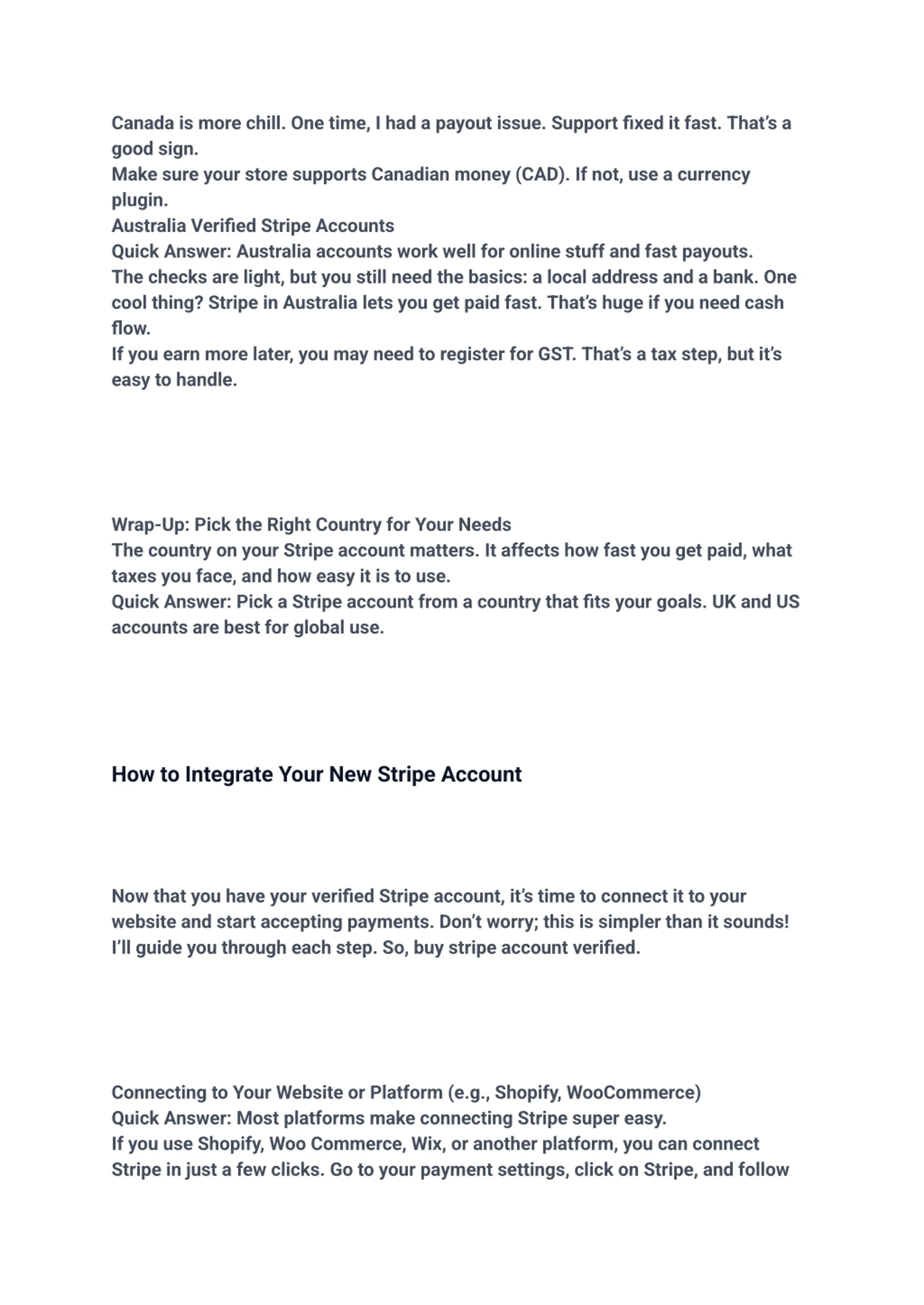 Canada is more chill. One time, I had a payout issue. Support fixed it fast. Thats a good sign. Make sure your store supports Canadian money (CAD). If not, use a currency plugin. Australia Verified Stripe Accounts Quick Answer: Australia accounts work well for online stuff and fast payouts. The checks are light, but you still need the basics: a local address and a bank. One cool thing? Stripe in Australia lets you get paid fast. That s huge if you need cash flow. If you earn more later, you may need to register for GST. That s a tax step, but it s easy to handle. Wrap-Up: Pick the Right Country for Your Needs The country on your Stripe account matters. It affects how fast you get paid, what taxes you face, and how easy it is to use. Quick Answer: Pick a Stripe account from a country that fits your goals. UK and US accounts are best for global use. How to Integrate Your New Stripe Account Now that you have your verified Stripe account, it s time to connect it to your website and start accepting payments. Don t worry; this is simpler than it sounds! I ll guide you through each step. So, buy stripe account verified. Connecting to Your Website or Platform (e.g., Shopify, WooCommerce) Quick Answer: Most platforms make connecting Stripe super easy. If you use Shopify, Woo Commerce, Wix, or another platform, you can connect Stripe in just a few clicks. Go to your payment settings, click on Stripe, and follow