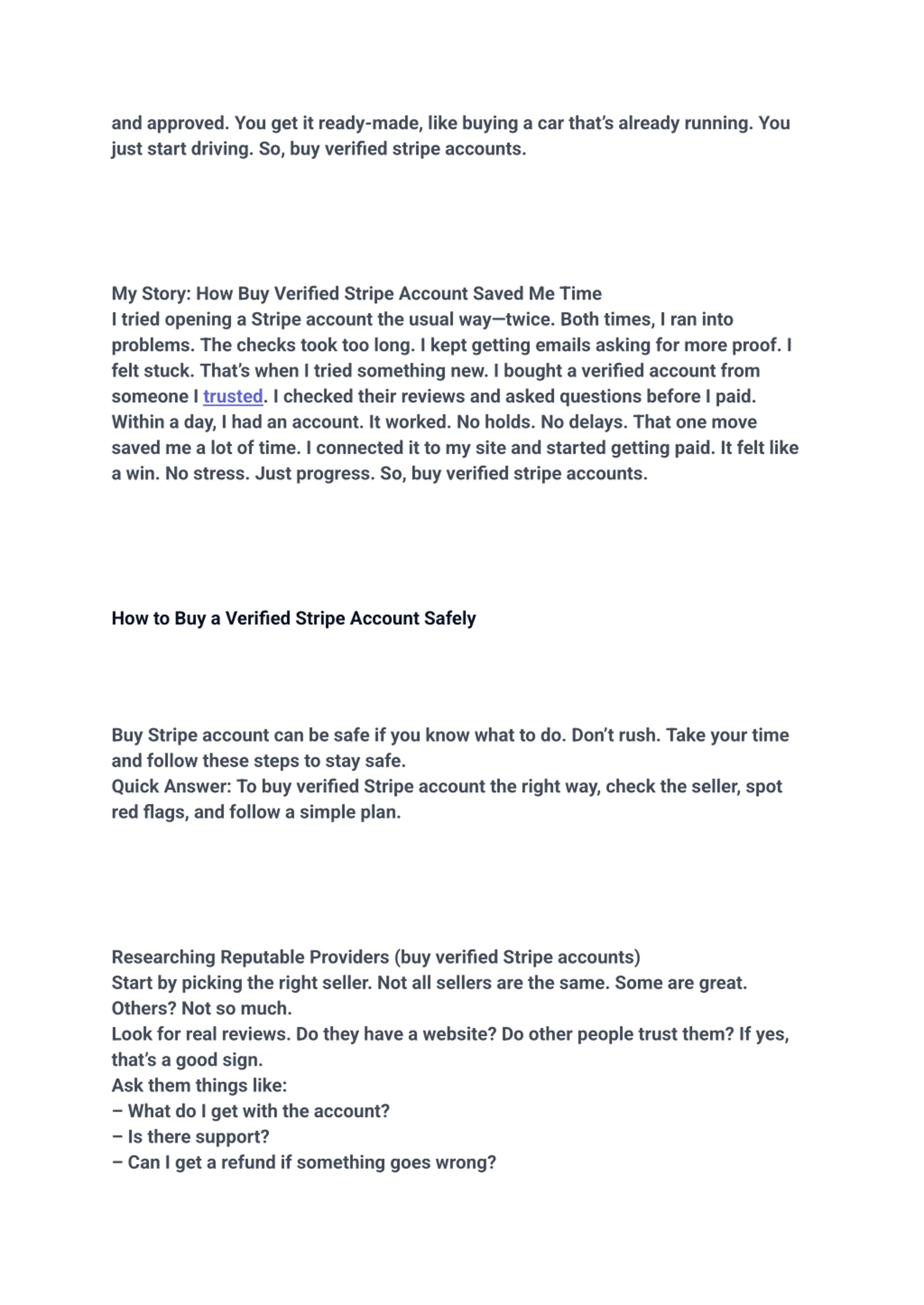 and approved. You get it ready-made, like buying a car thats already running. You just start driving. So, buy verified stripe accounts. My Story: How Buy Verified Stripe Account Saved Me Time I tried opening a Stripe account the usual way twice. Both times, I ran into problems. The checks took too long. I kept getting emails asking for more proof. I felt stuck. That s when I tried something new. I bought a verified account from someone I trusted. I checked their reviews and asked questions before I paid. Within a day, I had an account. It worked. No holds. No delays. That one move saved me a lot of time. I connected it to my site and started getting paid. It felt like a win. No stress. Just progress. So, buy verified stripe accounts. How to Buy a Verified Stripe Account Safely Buy Stripe account can be safe if you know what to do. Don t rush. Take your time and follow these steps to stay safe. Quick Answer: To buy verified Stripe account the right way, check the seller, spot red flags, and follow a simple plan. Researching Reputable Providers (buy verified Stripe accounts) Start by picking the right seller. Not all sellers are the same. Some are great. Others? Not so much. Look for real reviews. Do they have a website? Do other people trust them? If yes, that s a good sign. Ask them things like: What do I get with the account? Is there support? Can I get a refund if something goes wrong?