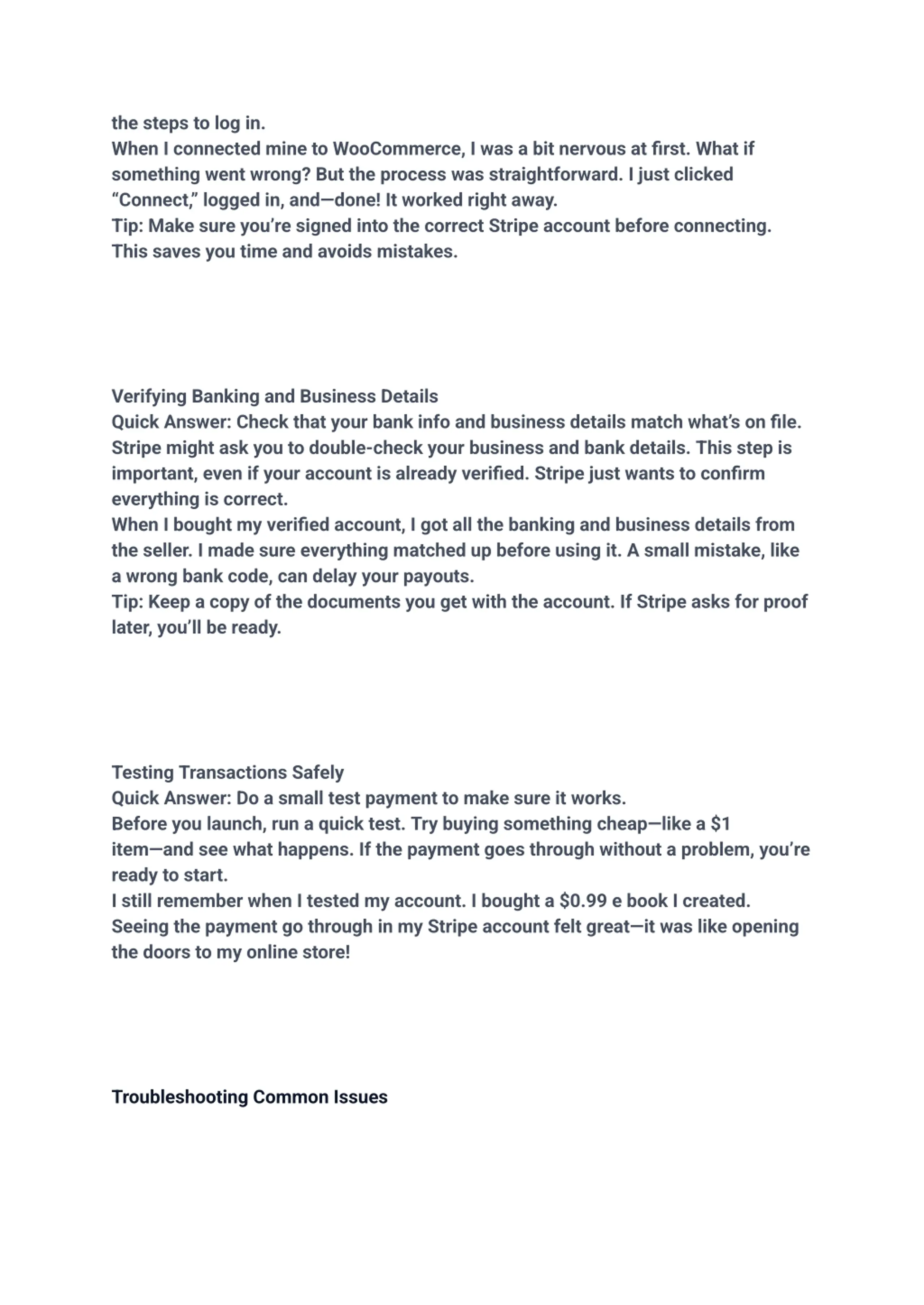 the steps to log in. When I connected mine to WooCommerce, I was a bit nervous at first. What if something went wrong? But the process was straightforward. I just clicked Connect, logged in, and done! It worked right away. Tip: Make sure you re signed into the correct Stripe account before connecting. This saves you time and avoids mistakes. Verifying Banking and Business Details Quick Answer: Check that your bank info and business details match what s on file. Stripe might ask you to double-check your business and bank details. This step is important, even if your account is already verified. Stripe just wants to confirm everything is correct. When I bought my verified account, I got all the banking and business details from the seller. I made sure everything matched up before using it. A small mistake, like a wrong bank code, can delay your payouts. Tip: Keep a copy of the documents you get with the account. If Stripe asks for proof later, you ll be ready. Testing Transactions Safely Quick Answer: Do a small test payment to make sure it works. Before you launch, run a quick test. Try buying something cheap like a $1 item and see what happens. If the payment goes through without a problem, you re ready to start. I still remember when I tested my account. I bought a $0.99 e book I created. Seeing the payment go through in my Stripe account felt great it was like opening the doors to my online store! Troubleshooting Common Issues