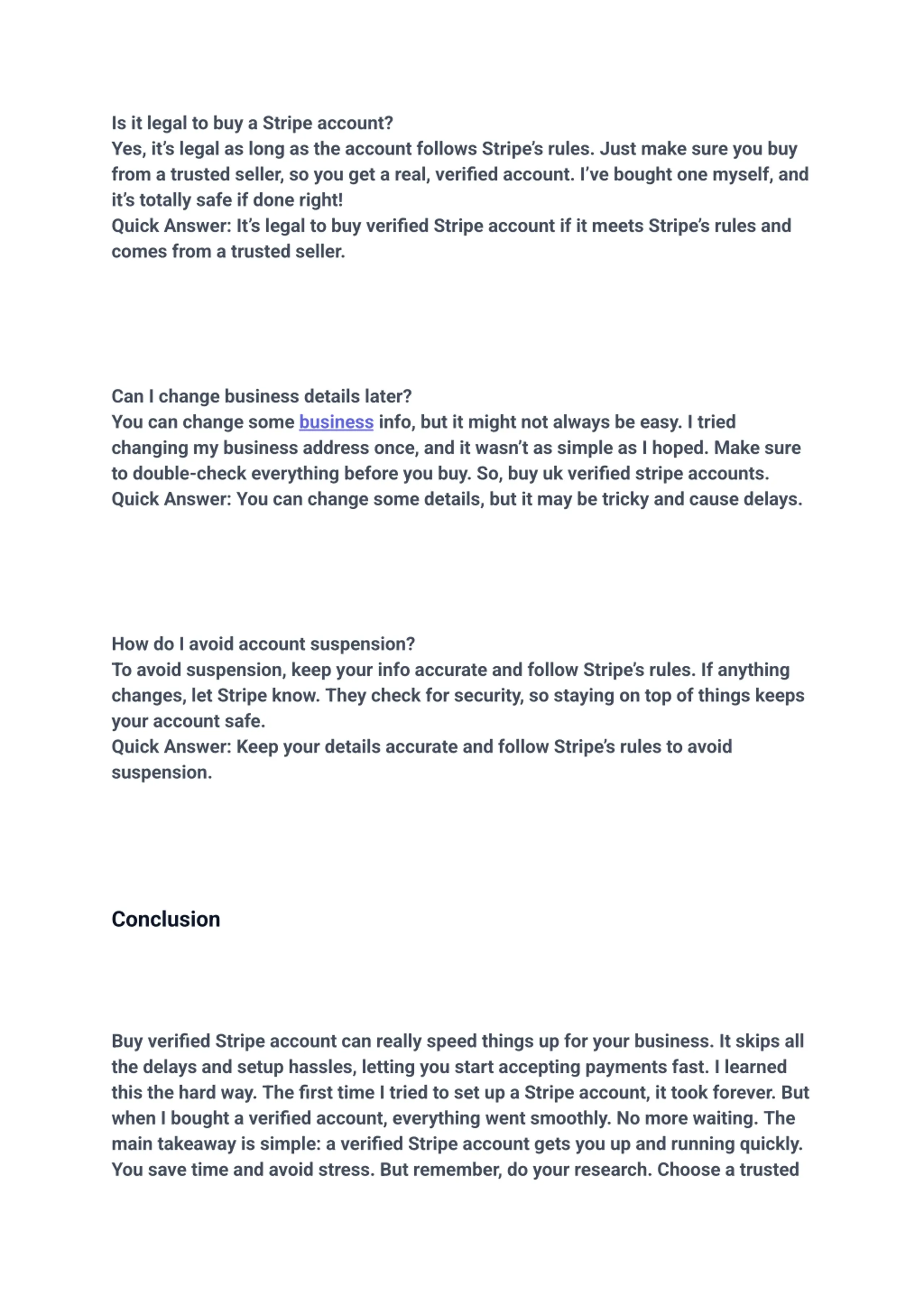 15. Is it legal to buy a Stripe account? Yes, it s legal as long as the account follows Stripe s rules. Just make sure you buy from a trusted seller, so you get a real, verified account. I ve bought one myself, and it s totally safe if done right! Quick Answer: It s legal to buy verified Stripe account if it meets Stripe s rules and comes from a trusted seller. Can I change business details later? You can change some business info, but it might not always be easy. I tried changing my business address once, and it wasn t as simple as I hoped. Make sure to double-check everything before you buy. So, buy uk verified stripe accounts. Quick Answer: You can change some details, but it may be tricky and cause delays. How do I avoid account suspension? To avoid suspension, keep your info accurate and follow Stripe s rules. If anything changes, let Stripe know. They check for security, so staying on top of things keeps your account safe. Quick Answer: Keep your details accurate and follow Stripe s rules to avoid suspension. Conclusion Buy verified Stripe account can really speed things up for your business. It skips all the delays and setup hassles, letting you start accepting payments fast. I learned this the hard way. The first time I tried to set up a Stripe account, it took forever. But when I bought a verified account, everything went smoothly. No more waiting. The main takeaway is simple: a verified Stripe account gets you up and running quickly. You save time and avoid stress. But remember, do your research. Choose a trusted