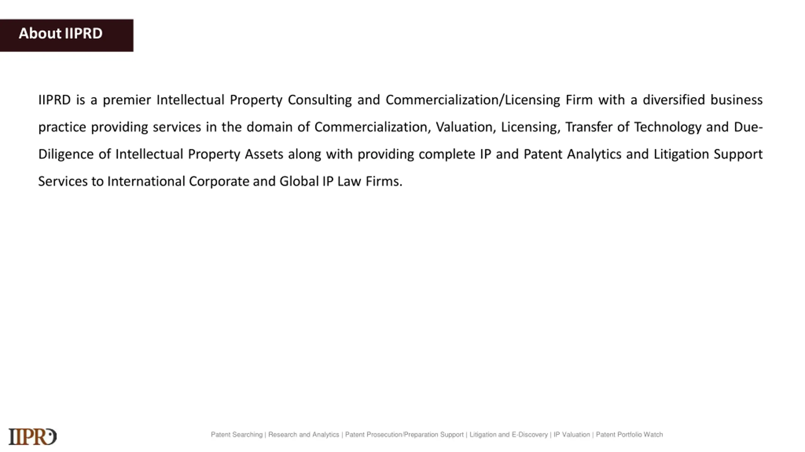 AboutIIPRD IIPRD is a premier Intellectual Property Consulting and Commercialization/Licensing Firm with a diversified business practice providing services in the domain of Commercialization, Valuation, Licensing, Transfer of Technology and Due- Diligence of Intellectual Property Assets along with providing complete IP and Patent Analytics and Litigation Support Services to International Corporate and Global IP Law Firms. Patent Searching | Research and Analytics | Patent Prosecution/Preparation Support | Litigation and E-Discovery | IP Valuation | Patent Portfolio Watch