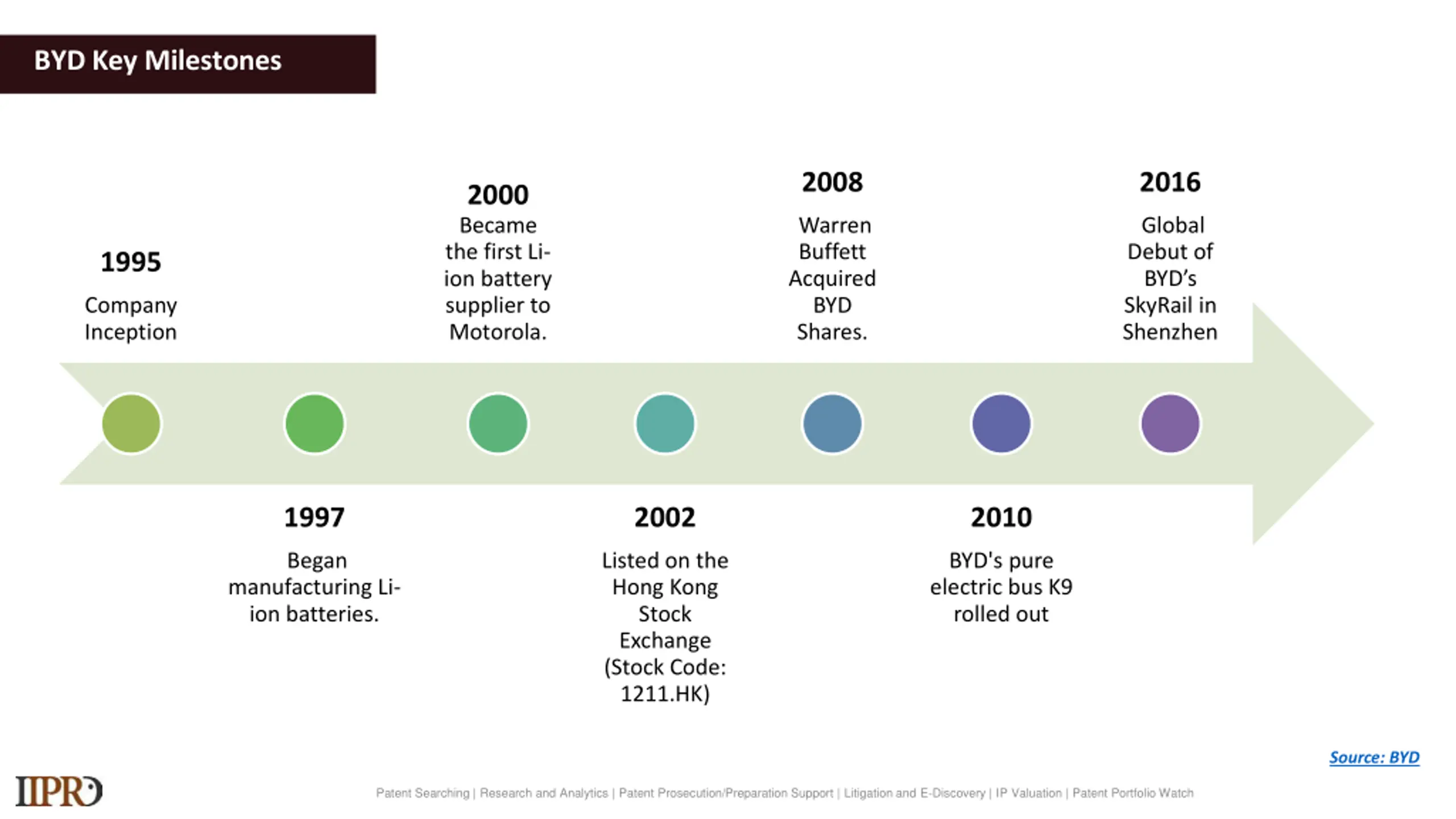 BYD Key Milestones 2008 2016 2000 Became the first Li- ion battery supplier to Motorola. Warren Buffett Acquired BYD Shares. Global Debut of BYD s SkyRail in Shenzhen 1995 Company Inception 1997 2002 2010 Began Listed on the Hong Kong Stock Exchange (Stock Code: 1211.HK) BYD's pure electric bus K9 rolled out manufacturing Li- ion batteries. Source: BYD Patent Searching | Research and Analytics | Patent Prosecution/Preparation Support | Litigation and E-Discovery | IP Valuation | Patent Portfolio Watch