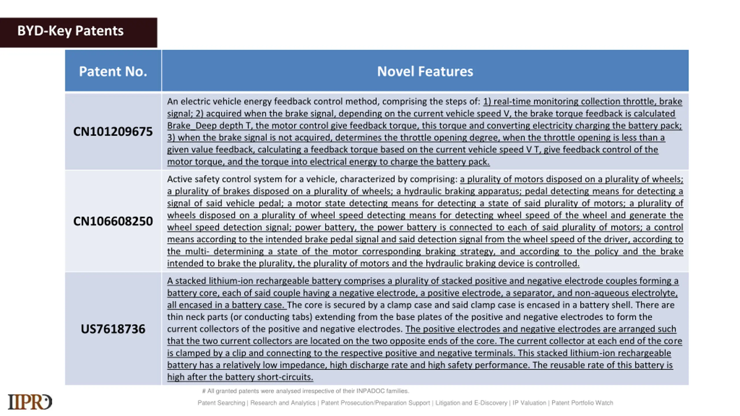 BYD-Key Patents Patent No. Novel Features An electric vehicle energy feedback control method, comprising the steps of: 1) real-time monitoring collection throttle, brake signal; 2) acquired when the brake signal, depending on the current vehicle speed V, the brake torque feedback is calculated Brake_Deep depth T, the motor control give feedback torque, this torque and converting electricity charging the battery pack; 3) when the brake signal is not acquired, determines the throttle opening degree, when the throttle opening is less than a given value feedback, calculating a feedback torque based on the current vehicle speed V T, give feedback control of the motor torque, and the torque into electrical energy to charge the battery pack. CN101209675 Active safety control system for a vehicle, characterized by comprising: a plurality of motors disposed on a plurality of wheels; a plurality of brakes disposed on a plurality of wheels; a hydraulic braking apparatus; pedal detecting means for detecting a signal of said vehicle pedal; a motor state detecting means for detecting a state of said plurality of motors; a plurality of wheels disposed on a plurality of wheel speed detecting means for detecting wheel speed of the wheel and generate the wheel speed detection signal; power battery, the power battery is connected to each of said plurality of motors; a control means according to the intended brake pedal signal and said detection signal from the wheel speed of the driver, according to the multi- determining a state of the motor corresponding braking strategy, and according to the policy and the brake intended to brake the plurality, the plurality of motors and the hydraulic braking device is controlled. CN106608250 A stacked lithium-ion rechargeable battery comprises a plurality of stacked positive and negative electrode couples forming a battery core, each of said couple having a negative electrode, a positive electrode, a separator, and non-aqueous electrolyte, all encased in a battery case. The core is secured by a clamp case and said clamp case is encased in a battery shell. There are thin neck parts (or conducting tabs) extending from the base plates of the positive and negative electrodes to form the current collectors of the positive and negative electrodes. The positive electrodes and negative electrodes are arranged such that the two current collectors are located on the two opposite ends of the core. The current collector at each end of the core is clamped by a clip and connecting to the respective positive and negative terminals. This stacked lithium-ion rechargeable battery has a relatively low impedance, high discharge rate and high safety performance. The reusable rate of this battery is high after the battery short-circuits. US7618736 # All granted patents were analysed irrespective of their INPADOC families. Patent Searching | Research and Analytics | Patent Prosecution/Preparation Support | Litigation and E-Discovery | IP Valuation | Patent Portfolio Watch