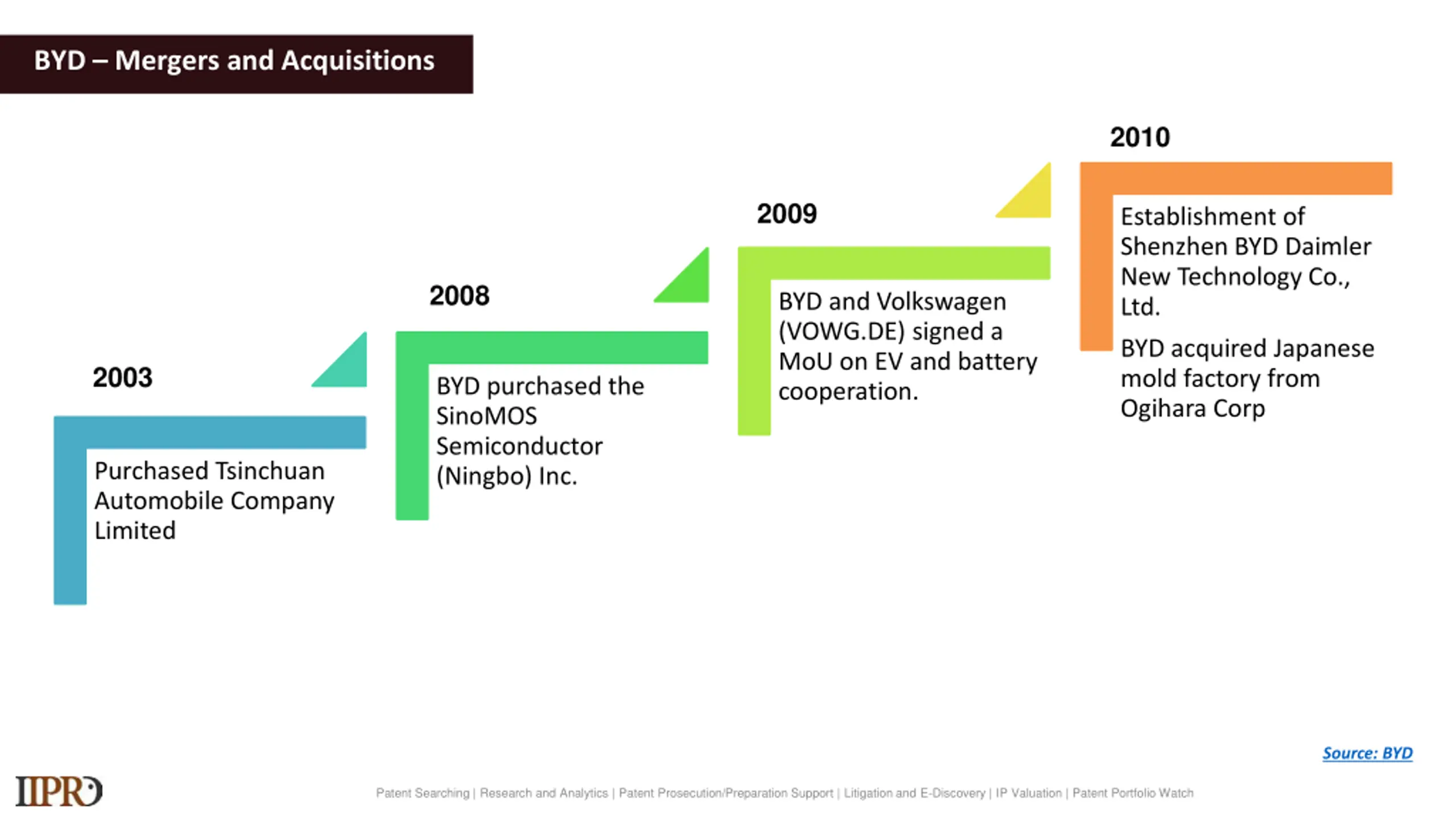 BYD Mergers and Acquisitions 2010 2009 Establishment of Shenzhen BYD Daimler New Technology Co., Ltd. 2008 BYD and Volkswagen (VOWG.DE) signed a MoU on EV and battery cooperation. BYD acquired Japanese mold factory from Ogihara Corp 2003 BYD purchased the SinoMOS Semiconductor (Ningbo) Inc. Purchased Tsinchuan Automobile Company Limited Source: BYD Patent Searching | Research and Analytics | Patent Prosecution/Preparation Support | Litigation and E-Discovery | IP Valuation | Patent Portfolio Watch