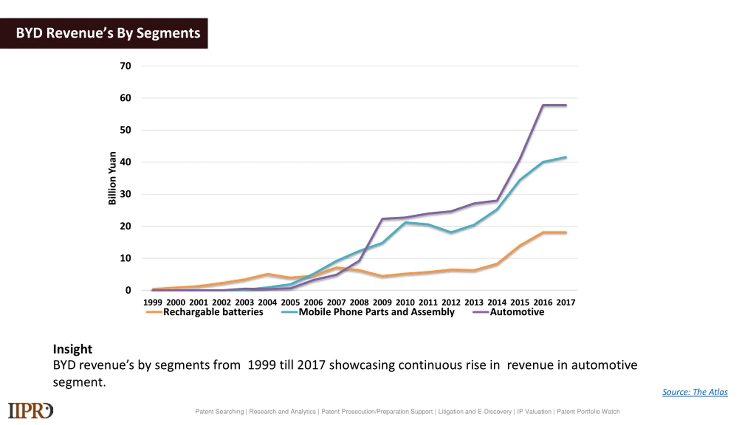 BYD Revenues By Segments 70 60 50 Billion Yuan 40 30 20 10 0 1999 2000 2001 2002 2003 2004 2005 2006 2007 2008 2009 2010 2011 2012 2013 2014 2015 2016 2017 Rechargable batteries Mobile Phone Parts and Assembly Automotive Insight BYD revenue s by segments from 1999 till 2017 showcasing continuous rise in revenue in automotive segment. Source: The Atlas Patent Searching | Research and Analytics | Patent Prosecution/Preparation Support | Litigation and E-Discovery | IP Valuation | Patent Portfolio Watch