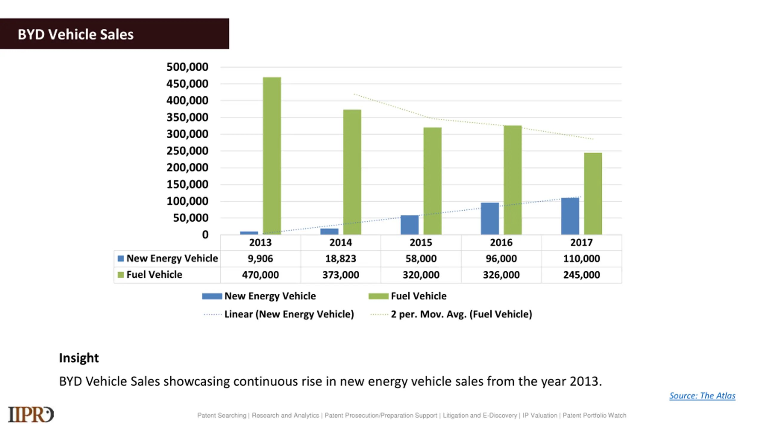 BYD Vehicle Sales 500,000 450,000 400,000 350,000 300,000 250,000 200,000 150,000 100,000 50,000 0 2013 9,906 470,000 2014 18,823 373,000 2015 58,000 320,000 2016 96,000 326,000 2017 110,000 245,000 New Energy Vehicle Fuel Vehicle New Energy Vehicle Fuel Vehicle Linear (New Energy Vehicle) 2 per. Mov. Avg. (Fuel Vehicle) Insight BYD Vehicle Sales showcasing continuous rise in new energy vehicle sales from the year 2013. Source: The Atlas Patent Searching | Research and Analytics | Patent Prosecution/Preparation Support | Litigation and E-Discovery | IP Valuation | Patent Portfolio Watch
