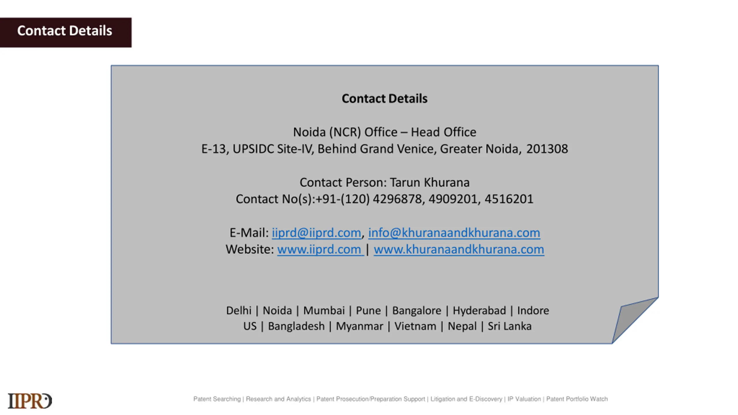 ContactDetails ContactDetails Noida (NCR) Office Head Office E-13, UPSIDC Site-IV, Behind Grand Venice, Greater Noida, 201308 Contact Person: Tarun Khurana Contact No(s):+91-(120) 4296878, 4909201, 4516201 E-Mail: iiprd@iiprd.com, info@khuranaandkhurana.com Website: www.iiprd.com| www.khuranaandkhurana.com Delhi | Noida | Mumbai | Pune | Bangalore | Hyderabad | Indore US | Bangladesh | Myanmar | Vietnam | Nepal | Sri Lanka Patent Searching | Research and Analytics | Patent Prosecution/Preparation Support | Litigation and E-Discovery | IP Valuation | Patent Portfolio Watch