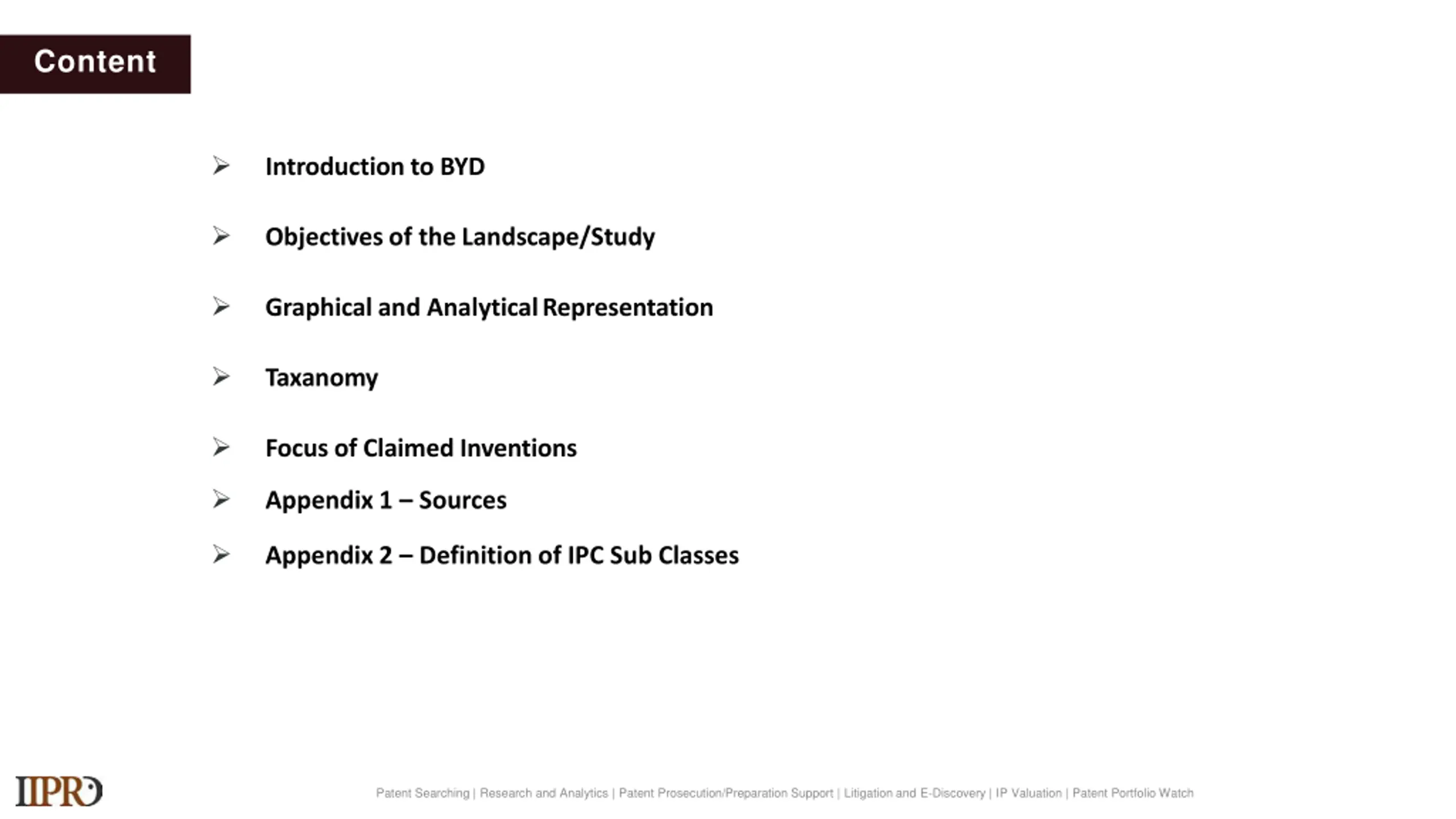 Content Introduction to BYD Objectivesof theLandscape/Study Graphical and AnalyticalRepresentation Taxanomy Focus of Claimed Inventions Appendix 1 Sources Appendix 2 Definition of IPC Sub Classes Patent Searching | Research and Analytics | Patent Prosecution/Preparation Support | Litigation and E-Discovery | IP Valuation | Patent Portfolio Watch