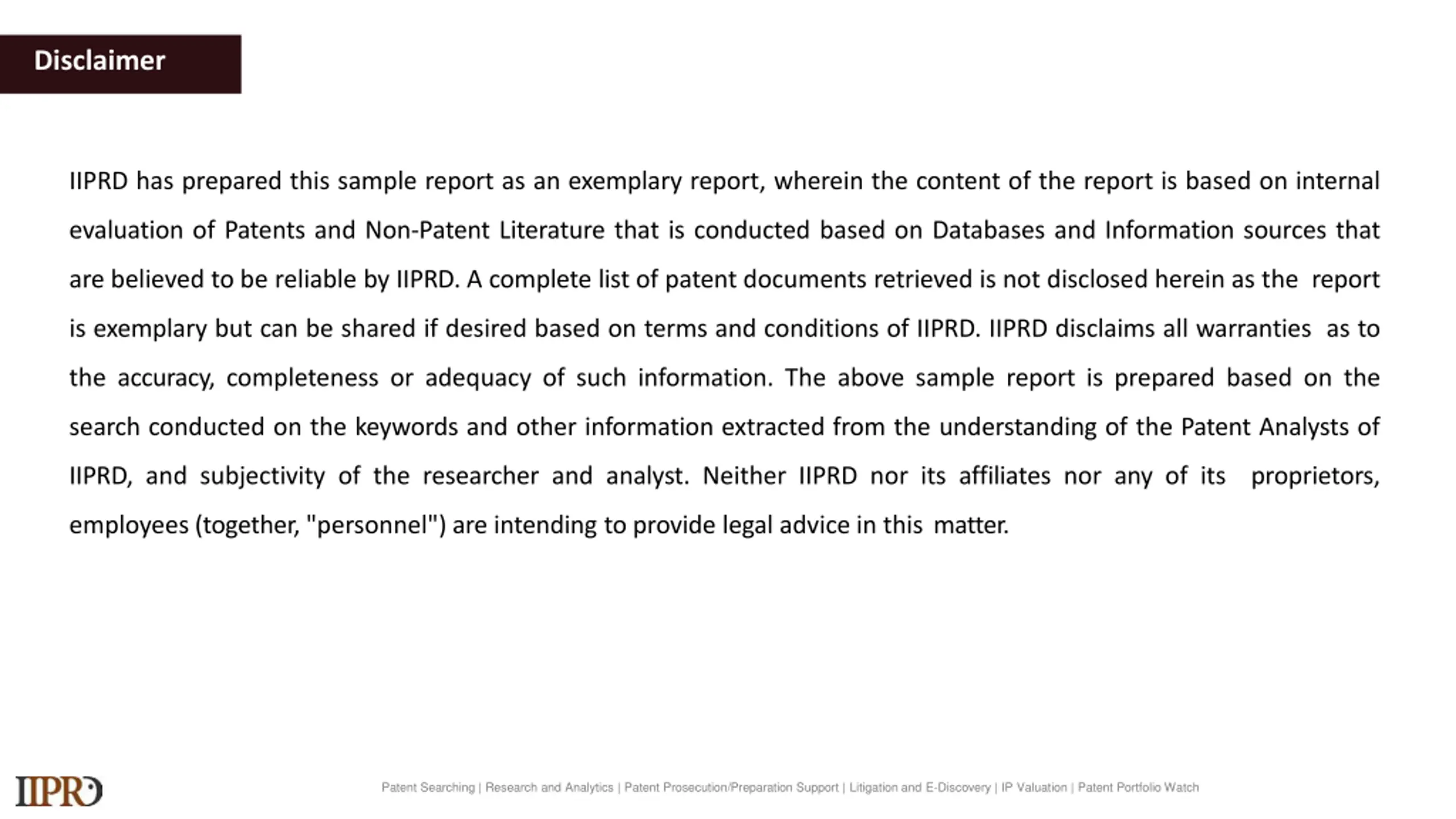 Disclaimer IIPRD has prepared this sample report as an exemplary report, wherein the content of the report is based on internal evaluation of Patents and Non-Patent Literature that is conducted based on Databases and Information sources that are believed to be reliable by IIPRD. A complete list of patent documents retrieved is not disclosed herein as the report is exemplary but can be shared if desired based on terms and conditions of IIPRD. IIPRD disclaims all warranties as to the accuracy, completeness or adequacy of such information. The above sample report is prepared based on the search conducted on the keywords and other information extracted from the understanding of the Patent Analysts of IIPRD, and subjectivity of the researcher and analyst. Neither IIPRD nor its affiliates nor any of its proprietors, employees (together, "personnel") are intending to provide legal advice in this matter. Patent Searching | Research and Analytics | Patent Prosecution/Preparation Support | Litigation and E-Discovery | IP Valuation | Patent Portfolio Watch