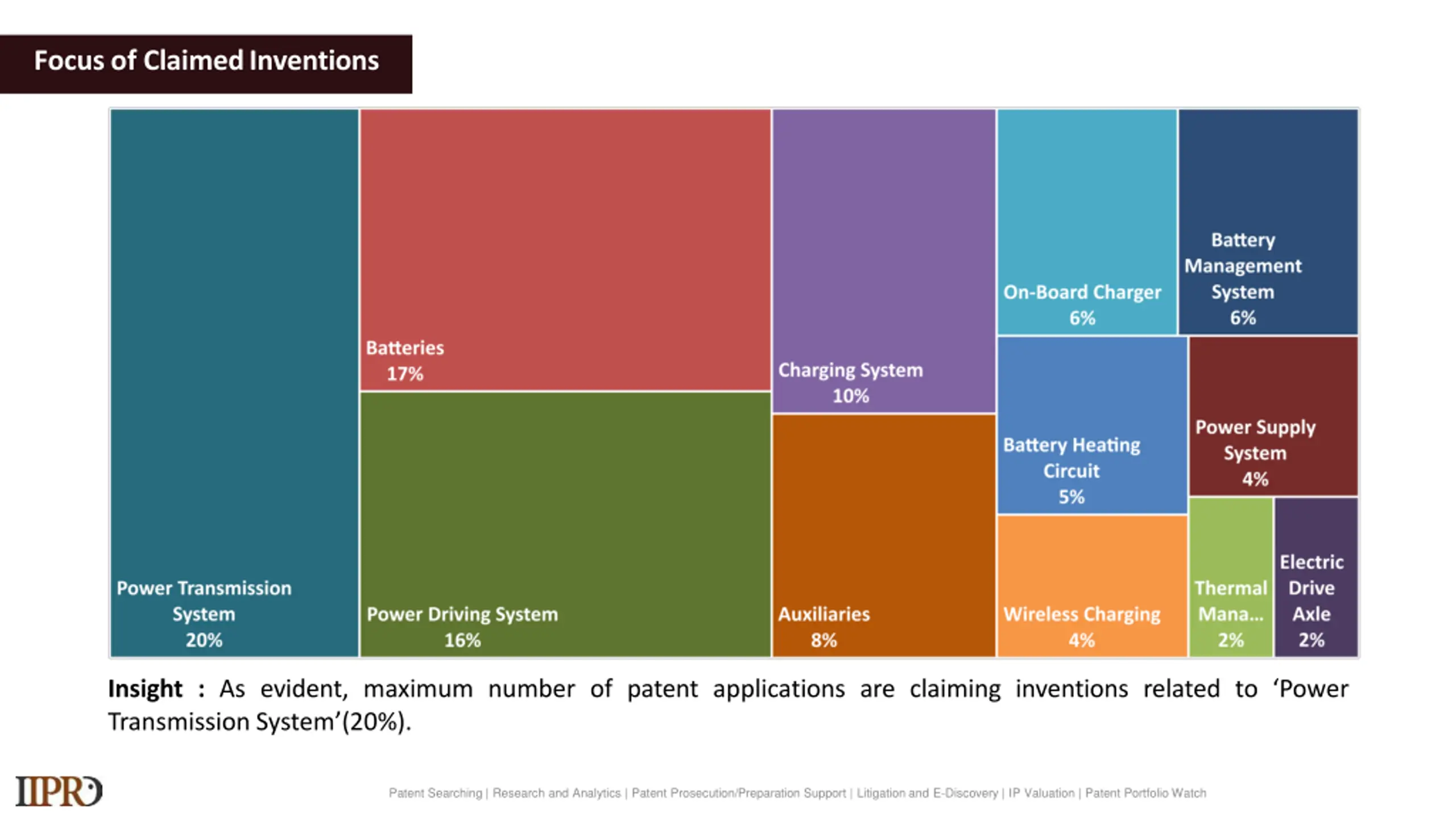 Focus of ClaimedInventions Insight : As evident, maximum number of patent applications are claiming inventions related to Power Transmission System (20%). Patent Searching | Research and Analytics | Patent Prosecution/Preparation Support | Litigation and E-Discovery | IP Valuation | Patent Portfolio Watch