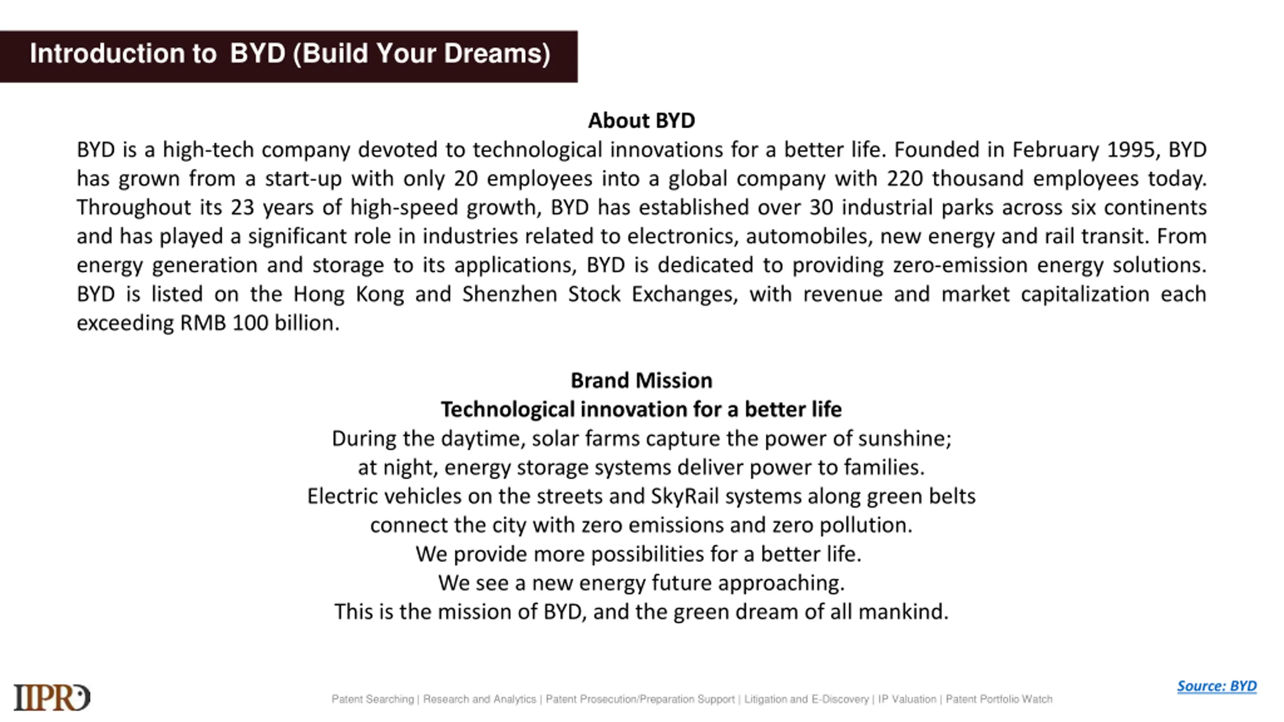 Introduction to BYD (Build Your Dreams) About BYD BYD is a high-tech company devoted to technological innovations for a better life. Founded in February 1995, BYD has grown from a start-up with only 20 employees into a global company with 220 thousand employees today. Throughout its 23 years of high-speed growth, BYD has established over 30 industrial parks across six continents and has played a significant role in industries related to electronics, automobiles, new energy and rail transit. From energy generation and storage to its applications, BYD is dedicated to providing zero-emission energy solutions. BYD is listed on the Hong Kong and Shenzhen Stock Exchanges, with revenue and market capitalization each exceeding RMB 100 billion. Brand Mission Technological innovation for a better life During the daytime, solar farms capture the power of sunshine; at night, energy storage systems deliver power to families. Electric vehicles on the streets and SkyRail systems along green belts connect the city with zero emissions and zero pollution. We provide more possibilities for a better life. We see a new energy future approaching. This is the mission of BYD, and the green dream of all mankind. Source: BYD Patent Searching | Research and Analytics | Patent Prosecution/Preparation Support | Litigation and E-Discovery | IP Valuation | Patent Portfolio Watch