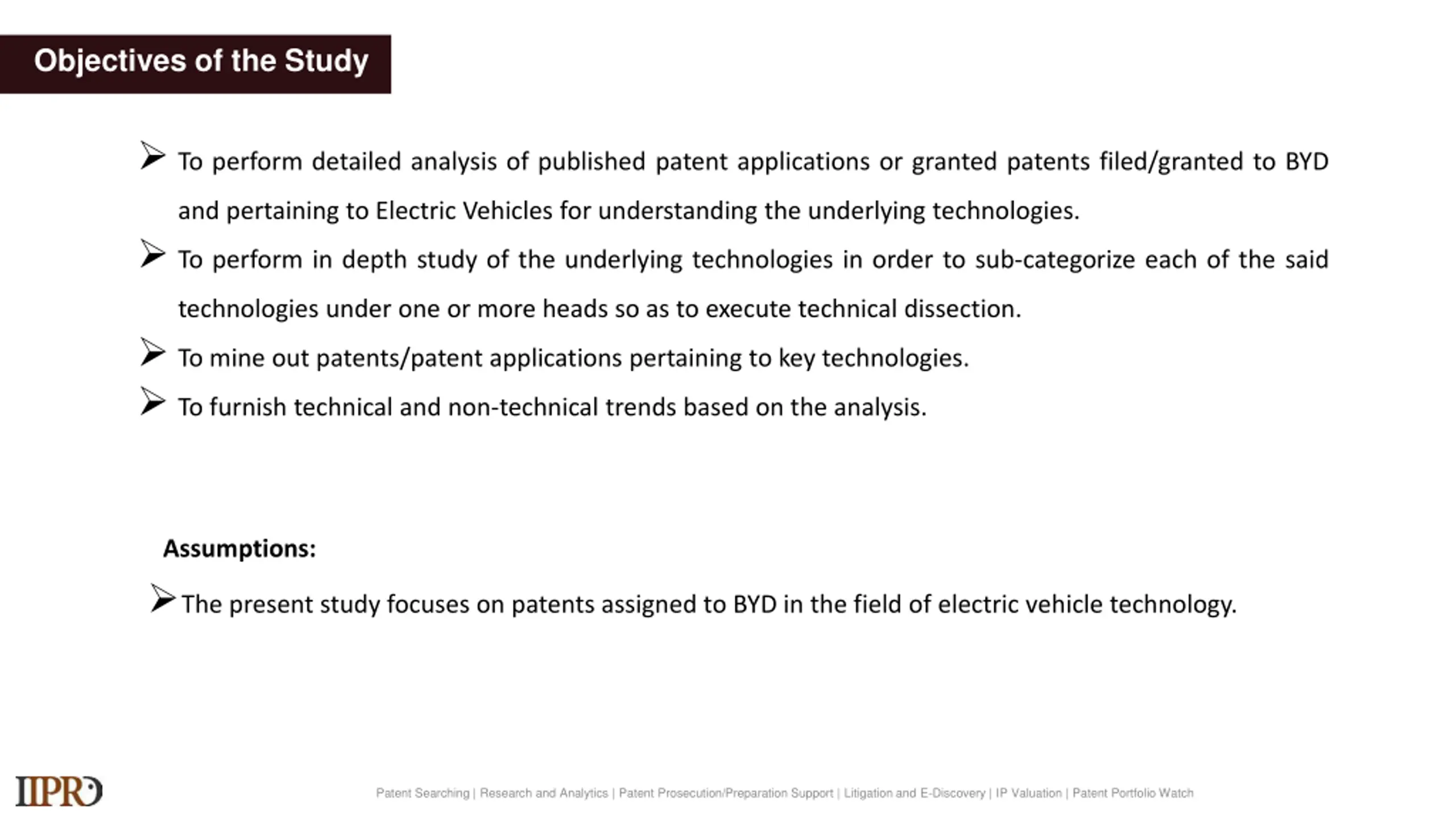 Objectives of the Study To perform detailed analysis of published patent applications or granted patents filed/granted to BYD and pertaining to Electric Vehicles for understanding the underlying technologies. To perform in depth study of the underlying technologies in order to sub-categorize each of the said technologies under one or more heads so as to execute technical dissection. To mine out patents/patent applications pertaining to key technologies. To furnish technical and non-technical trends based on the analysis. Assumptions: The present study focuses on patents assigned to BYD in the field of electric vehicle technology. Patent Searching | Research and Analytics | Patent Prosecution/Preparation Support | Litigation and E-Discovery | IP Valuation | Patent Portfolio Watch