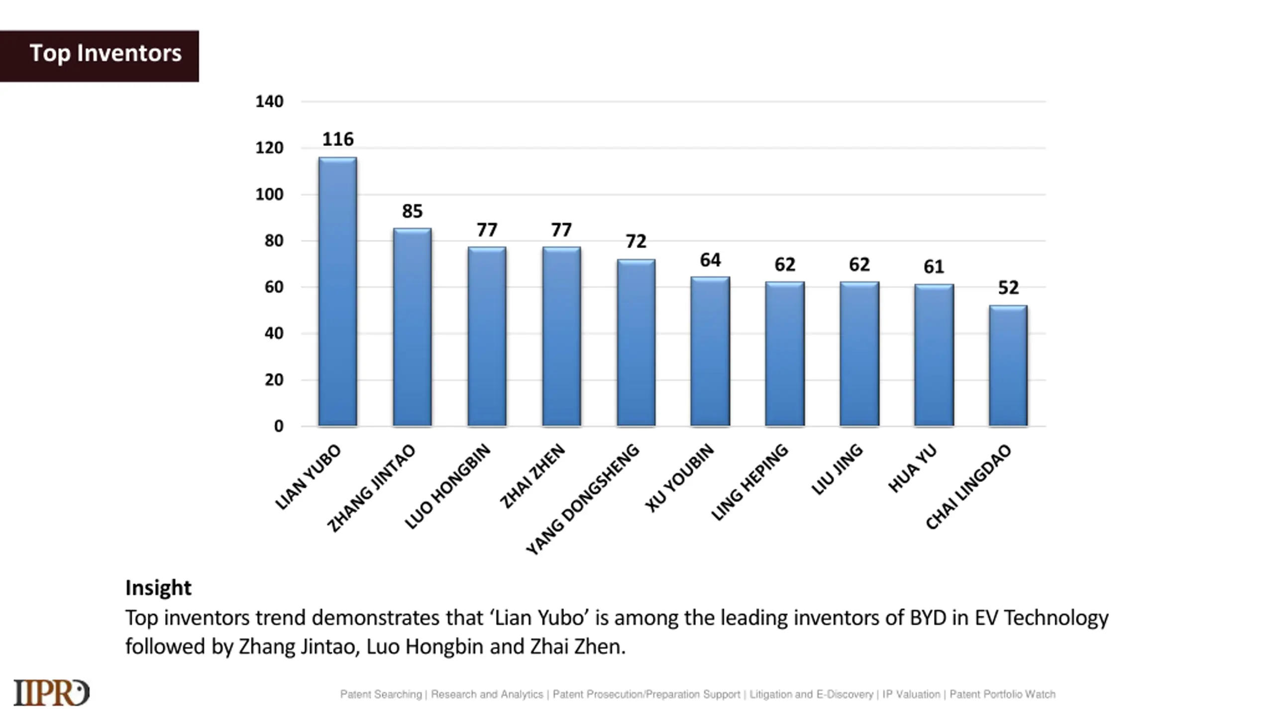 Top Inventors 140 116 120 100 85 77 77 72 80 64 62 62 61 52 60 40 20 0 Insight Top inventors trend demonstrates that Lian Yubo is among the leading inventors of BYD in EV Technology followed by Zhang Jintao, Luo Hongbin and Zhai Zhen. Patent Searching | Research and Analytics | Patent Prosecution/Preparation Support | Litigation and E-Discovery | IP Valuation | Patent Portfolio Watch