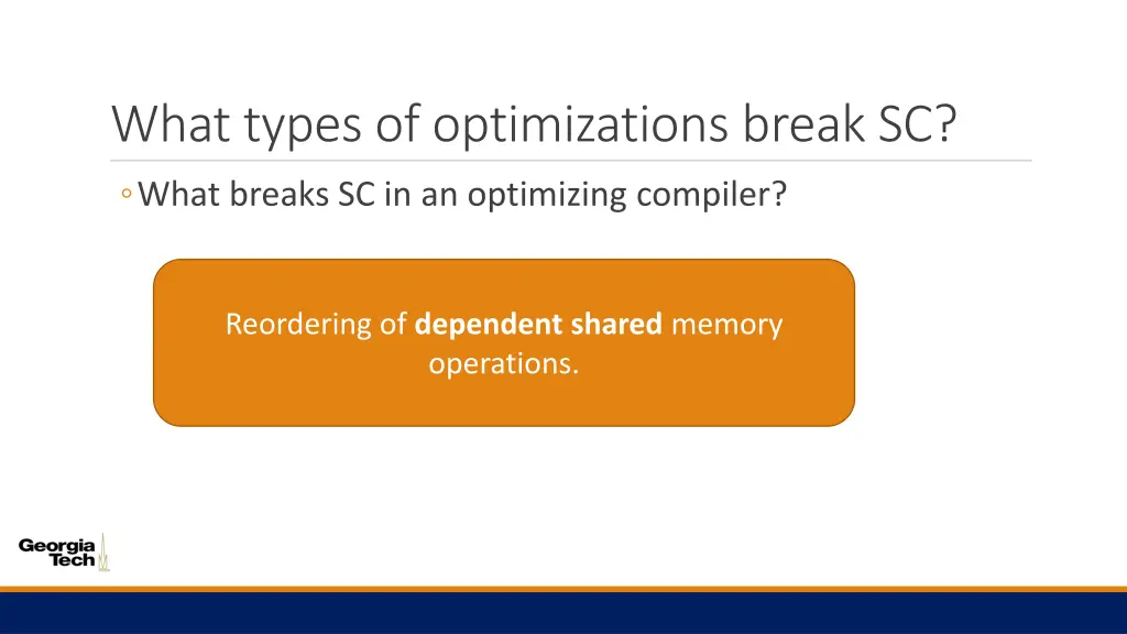 What types of optimizations break SC? What breaks SC in an optimizing compiler? Reordering of dependentshared memory operations.