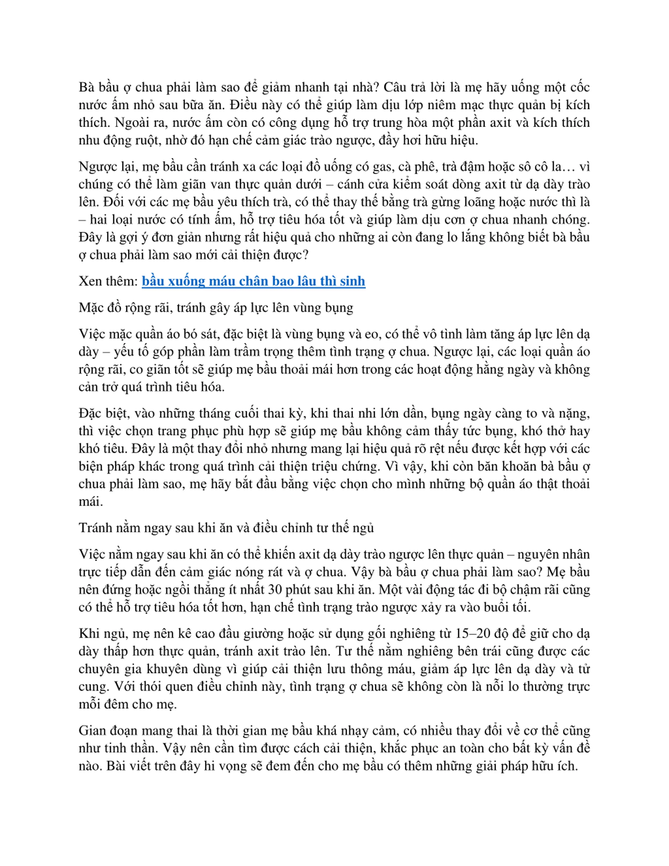 B bu chua phi lm sao gim nhanh ti nh? Cu tr li l m hy ung mt cc n c m nh sau b a n. i u n y c th gi p l m d u l p ni m m c th c qu n b k ch th ch. Ngo i ra, n c m c n c c ng d ng h tr trung h a m t ph n axit v k ch th ch nhu ng ru t, nh h n ch c m gi c tr o ng c, y h i h u hi u. Ng c l i, m b u c n tr nh xa c c lo i u ng c gas, c ph , tr m ho c s c la v ch ng c th l m gi n van th c qu n d i c nh c a ki m so t d ng axit t d d y tr o l n. i v i c c m b u y u th ch tr , c th thay th b ng tr g ng lo ng ho c n c th l hai lo i n c c t nh m, h tr ti u h a t t v gi p l m d u c n chua nhanh ch ng. y l g i n gi n nh ng r t hi u qu cho nh ng ai c n ang lo l ng kh ng bi t b b u chua ph i l m sao m i c i thi n c? Xen th m: b u xu ng m u ch n bao l u th sinh M c r ng r i, tr nh g y p l c l n v ng b ng Vi c m c qu n o b s t, c bi t l v ng b ng v eo, c th v t nh l m t ng p l c l n d d y y u t g p ph n l m tr m tr ng th m t nh tr ng chua. Ng c l i, c c lo i qu n o r ng r i, co gi n t t s gi p m b u tho i m i h n trong c c ho t ng h ng ng y v kh ng c n tr qu tr nh ti u h a. c bi t, v o nh ng th ng cu i thai k , khi thai nhi l n d n, b ng ng y c ng to v n ng, th vi c ch n trang ph c ph h p s gi p m b u kh ng c m th y t c b ng, kh th hay kh ti u. y l m t thay i nh nh ng mang l i hi u qu r r t n u c k t h p v i c c bi n ph p kh c trong qu tr nh c i thi n tri u ch ng. V v y, khi c n b n kho n b b u chua ph i l m sao, m h y b t u b ng vi c ch n cho m nh nh ng b qu n o th t tho i m i. Tr nh n m ngay sau khi n v i u ch nh t th ng Vi c n m ngay sau khi n c th khi n axit d d y tr o ng c l n th c qu n nguy n nh n tr c ti p d n n c m gi c n ng r t v chua. V y b b u chua ph i l m sao? M b u n n ng ho c ng i th ng t nh t 30 ph t sau khi n. M t v i ng t c i b ch m r i c ng c th h tr ti u h a t t h n, h n ch t nh tr ng tr o ng c x y ra v o bu i t i. Khi ng , m n n k cao u gi ng ho c s d ng g i nghi ng t 15 20 gi cho d d y th p h n th c qu n, tr nh axit tr o l n. T th n m nghi ng b n tr i c ng c c c chuy n gia khuy n d ng v gi p c i thi n l u th ng m u, gi m p l c l n d d y v t cung. V i th i quen i u ch nh n y, t nh tr ng chua s kh ng c n l n i lo th ng tr c m i m cho m . Gian o n mang thai l th i gian m b u kh nh y c m, c nhi u thay i v c th c ng nh tinh th n. V y n n c n t m c c ch c i thi n, kh c ph c an to n cho b t k v n n o. B i vi t tr n y hi v ng s em n cho m b u c th m nh ng gi i ph p h u ch.