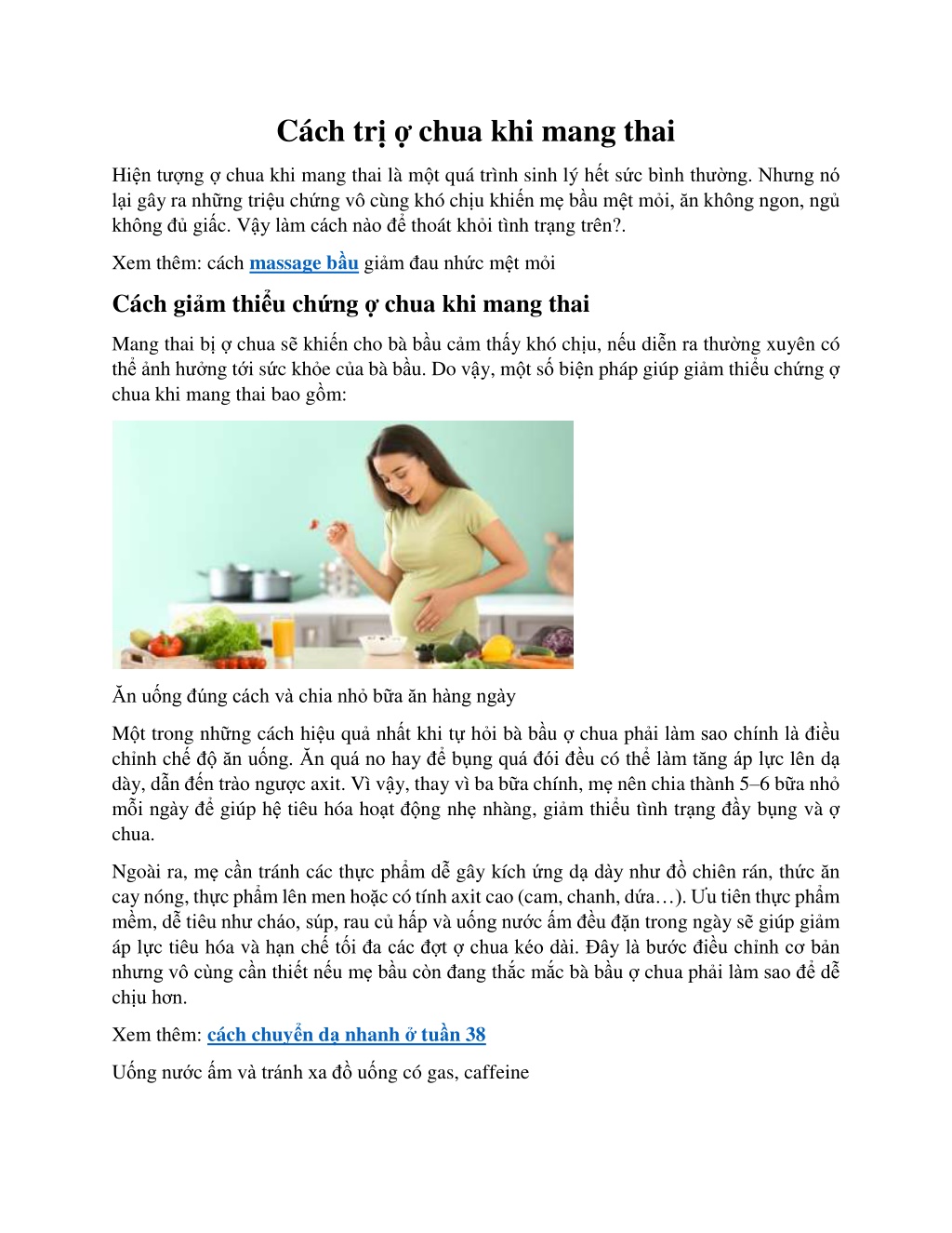 Cch tr chua khi mang thai Hi n t ng chua khi mang thai l m t qu tr nh sinh l h t s c b nh th ng. Nh ng n l i g y ra nh ng tri u ch ng v c ng kh ch u khi n m b u m t m i, n kh ng ngon, ng kh ng gi c. V y l m c ch n o tho t kh i t nh tr ng tr n?. Xem th m: c ch massage b u gi m au nh c m t m i C ch gi m thi u ch ng chua khi mang thai Mang thai b chua s khi n cho b b u c m th y kh ch u, n u di n ra th ng xuy n c th nh h ng t i s c kh e c a b b u. Do v y, m t s bi n ph p gi p gi m thi u ch ng chua khi mang thai bao g m: n u ng ng c ch v chia nh b a n h ng ng y M t trong nh ng c ch hi u qu nh t khi t h i b b u chua ph i l m sao ch nh l i u ch nh ch n u ng. n qu no hay b ng qu i u c th l m t ng p l c l n d d y, d n n tr o ng c axit. V v y, thay v ba b a ch nh, m n n chia th nh 5 6 b a nh m i ng y gi p h ti u h a ho t ng nh nh ng, gi m thi u t nh tr ng y b ng v chua. Ngo i ra, m c n tr nh c c th c ph m d g y k ch ng d d y nh chi n r n, th c n cay n ng, th c ph m l n men ho c c t nh axit cao (cam, chanh, d a ). u ti n th c ph m m m, d ti u nh ch o, s p, rau c h p v u ng n c m u n trong ng y s gi p gi m p l c ti u h a v h n ch t i a c c t chua k o d i. y l b c i u ch nh c b n nh ng v c ng c n thi t n u m b u c n ang th c m c b b u chua ph i l m sao d ch u h n. Xem th m: c ch chuy n d nhanh tu n 38 U ng n c m v tr nh xa u ng c gas, caffeine