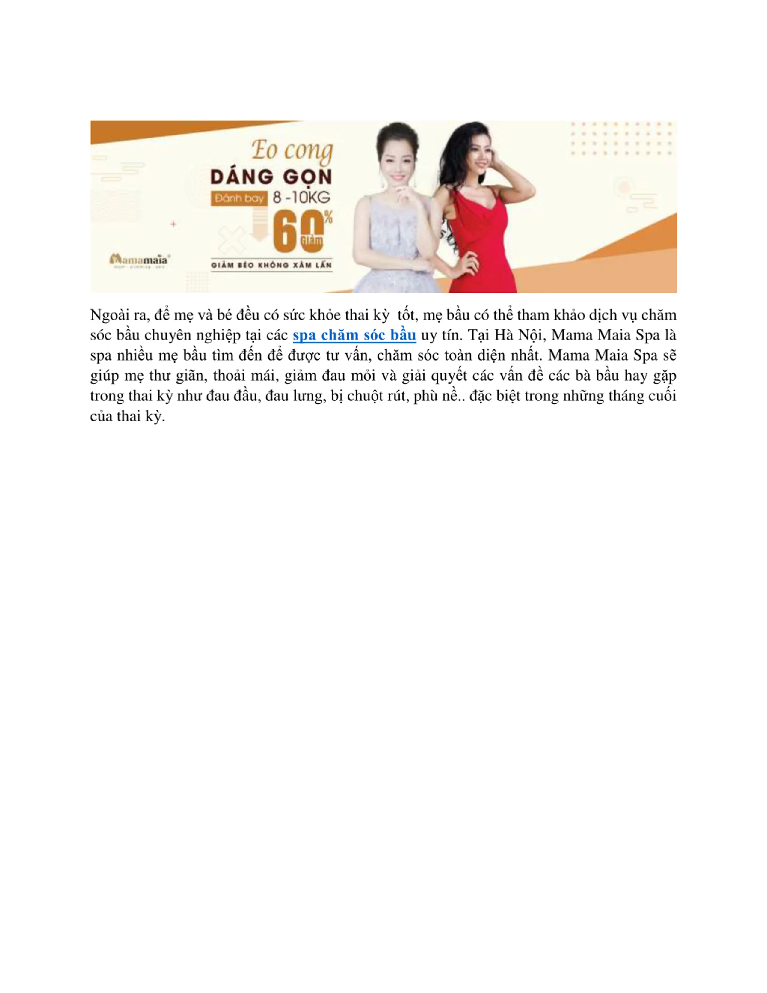 Ngoi ra, mv b u c sc khe thai k tt, m bu c th tham kho dch vchm s c b u chuy n nghi p t i c c spa ch m s c b u uy t n. T i H N i, Mama Maia Spa l spa nhi u m b u t m n c t v n, ch m s c to n di n nh t. Mama Maia Spa s gi p m th gi n, tho i m i, gi m au m i v gi i quy t c c v n c c b b u hay g p trong thai k nh au u, au l ng, b chu t r t, ph n .. c bi t trong nh ng th ng cu i c a thai k .