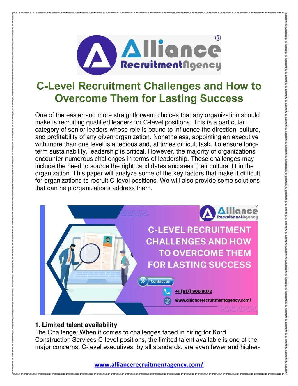 One of the easier and more straightforward choices that any organization should make is recruiting qualified leaders for C-level positions. This is a particular category of senior leaders whose role is bound to influence the direction, culture, and profitability of any given organization. Nonetheless, appointing an executive with more than one level is a tedious and, at times difficult task. To ensure long- term sustainability, leadership is critical. However, the majority of organizations encounter numerous challenges in terms of leadership. These challenges may include the need to source the right candidates and seek their cultural fit in the organization. This paper will analyze some of the key factors that make it difficult for organizations to recruit C-level positions. We will also provide some solutions that can help organizations address them. 1. Limited talent availability The Challenge: When it comes to challenges faced in hiring for Kord Construction Services C-level positions, the limited talent available is one of the major concerns. C-level executives, by all standards, are even fewer and higher- www.alliancerecruitmentagency.com/