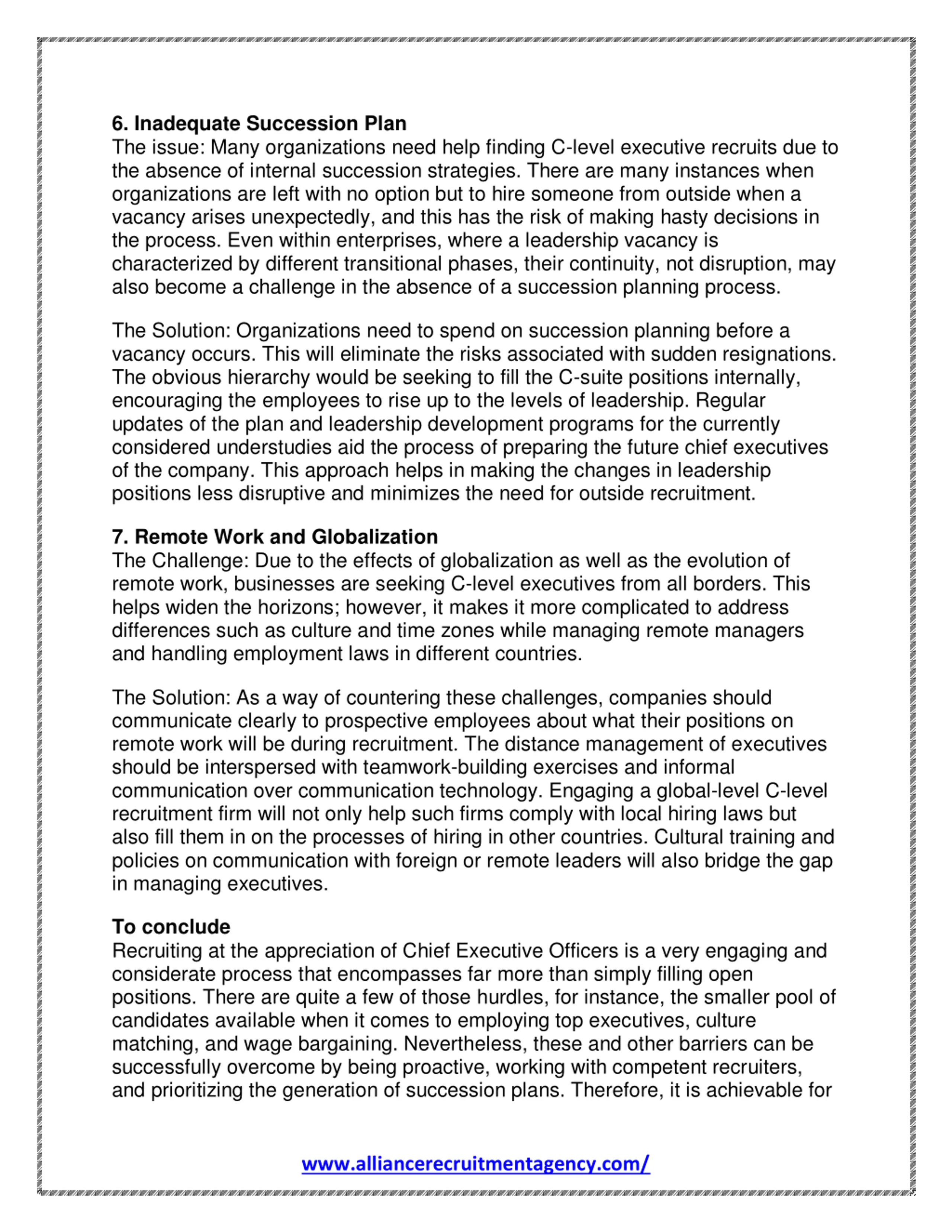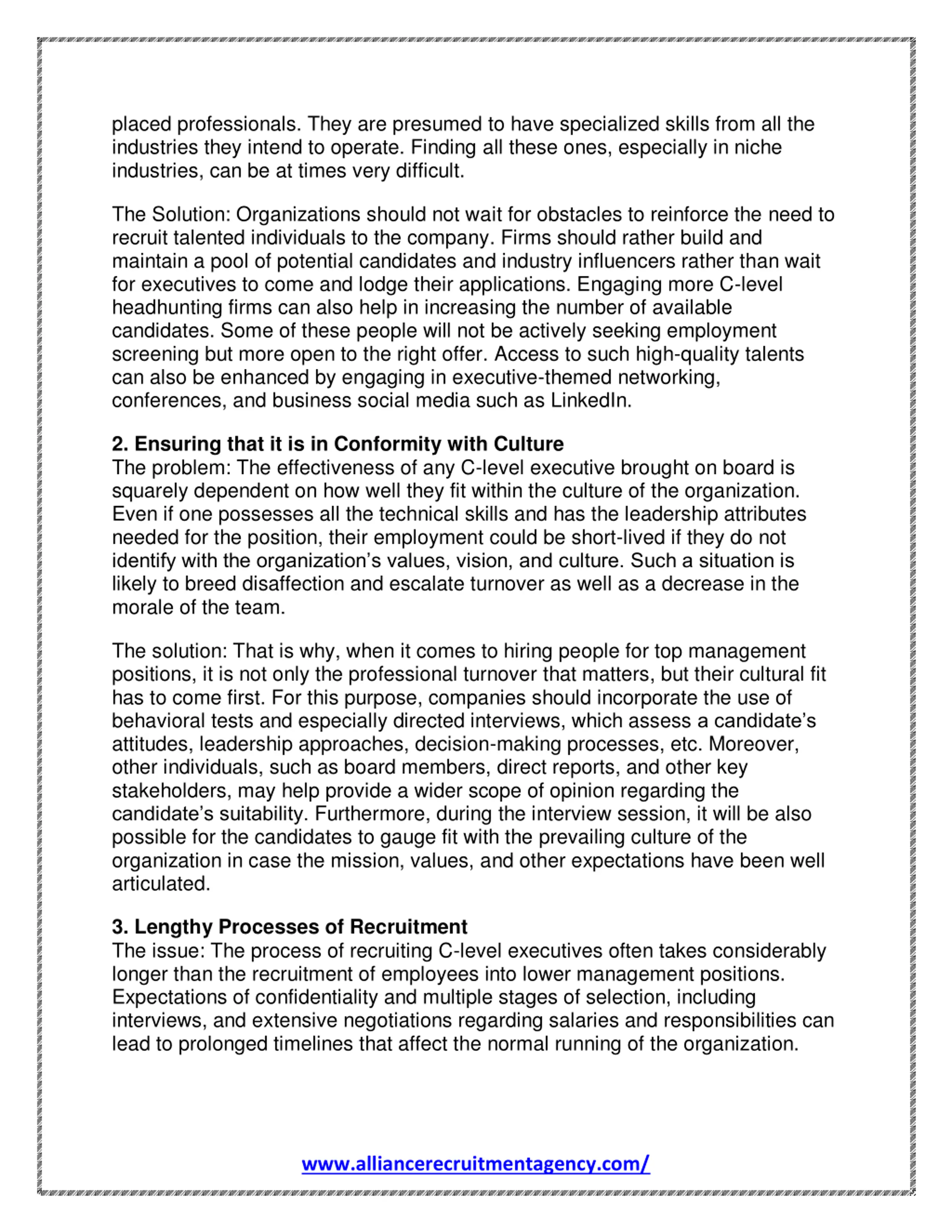 placed professionals. They are presumed to have specialized skills from all the industries they intend to operate. Finding all these ones, especially in niche industries, can be at times very difficult. The Solution: Organizations should not wait for obstacles to reinforce the need to recruit talented individuals to the company. Firms should rather build and maintain a pool of potential candidates and industry influencers rather than wait for executives to come and lodge their applications. Engaging more C-level headhunting firms can also help in increasing the number of available candidates. Some of these people will not be actively seeking employment screening but more open to the right offer. Access to such high-quality talents can also be enhanced by engaging in executive-themed networking, conferences, and business social media such as LinkedIn. 2. Ensuring that it is in Conformity with Culture The problem: The effectiveness of any C-level executive brought on board is squarely dependent on how well they fit within the culture of the organization. Even if one possesses all the technical skills and has the leadership attributes needed for the position, their employment could be short-lived if they do not identify with the organization s values, vision, and culture. Such a situation is likely to breed disaffection and escalate turnover as well as a decrease in the morale of the team. The solution: That is why, when it comes to hiring people for top management positions, it is not only the professional turnover that matters, but their cultural fit has to come first. For this purpose, companies should incorporate the use of behavioral tests and especially directed interviews, which assess a candidate s attitudes, leadership approaches, decision-making processes, etc. Moreover, other individuals, such as board members, direct reports, and other key stakeholders, may help provide a wider scope of opinion regarding the candidate s suitability. Furthermore, during the interview session, it will be also possible for the candidates to gauge fit with the prevailing culture of the organization in case the mission, values, and other expectations have been well articulated. 3. Lengthy Processes of Recruitment The issue: The process of recruiting C-level executives often takes considerably longer than the recruitment of employees into lower management positions. Expectations of confidentiality and multiple stages of selection, including interviews, and extensive negotiations regarding salaries and responsibilities can lead to prolonged timelines that affect the normal running of the organization. www.alliancerecruitmentagency.com/