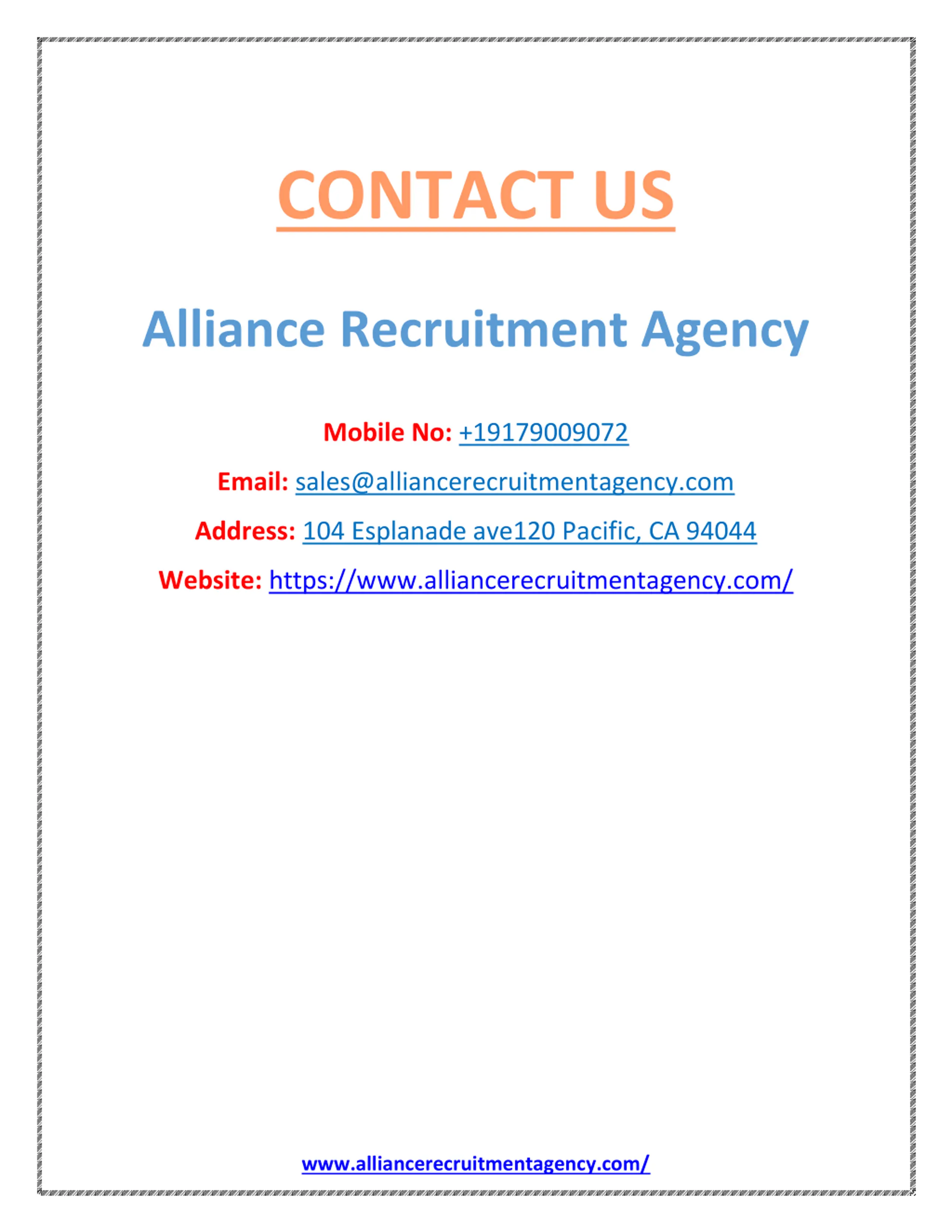 CONTACT US Alliance Recruitment Agency Mobile No: +19179009072 Email: sales@alliancerecruitmentagency.com Address: 104 Esplanade ave120 Pacific, CA 94044 Website: https://www.alliancerecruitmentagency.com/ www.alliancerecruitmentagency.com/