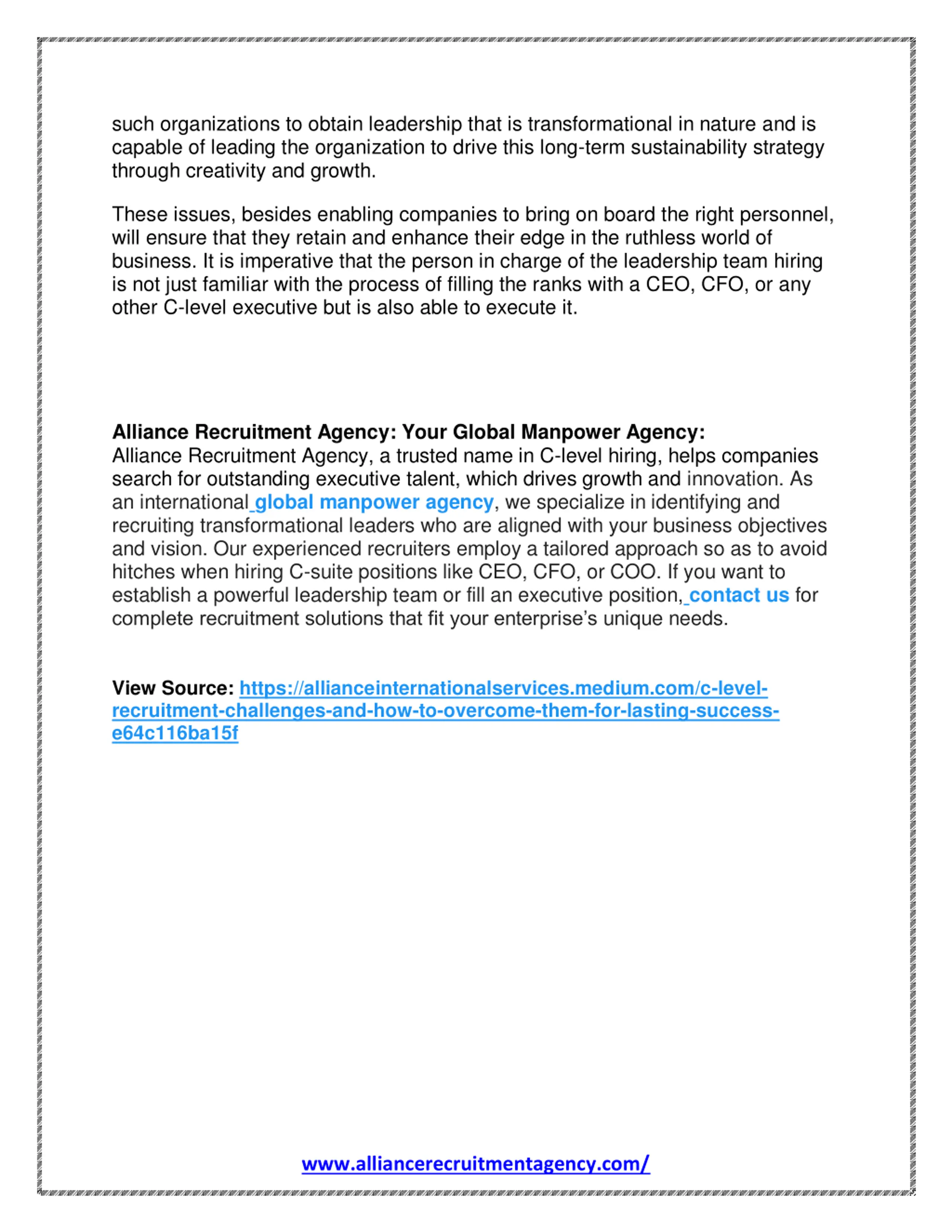 such organizations to obtain leadership that is transformational in nature and is capable of leading the organization to drive this long-term sustainability strategy through creativity and growth. These issues, besides enabling companies to bring on board the right personnel, will ensure that they retain and enhance their edge in the ruthless world of business. It is imperative that the person in charge of the leadership team hiring is not just familiar with the process of filling the ranks with a CEO, CFO, or any other C-level executive but is also able to execute it. Alliance Recruitment Agency: Your Global Manpower Agency: Alliance Recruitment Agency, a trusted name in C-level hiring, helps companies search for outstanding executive talent, which drives growth and innovation. As an international global manpower agency, we specialize in identifying and recruiting transformational leaders who are aligned with your business objectives and vision. Our experienced recruiters employ a tailored approach so as to avoid hitches when hiring C-suite positions like CEO, CFO, or COO. If you want to establish a powerful leadership team or fill an executive position, contact us for complete recruitment solutions that fit your enterprise s unique needs. View Source: https://allianceinternationalservices.medium.com/c-level- recruitment-challenges-and-how-to-overcome-them-for-lasting-success- e64c116ba15f www.alliancerecruitmentagency.com/