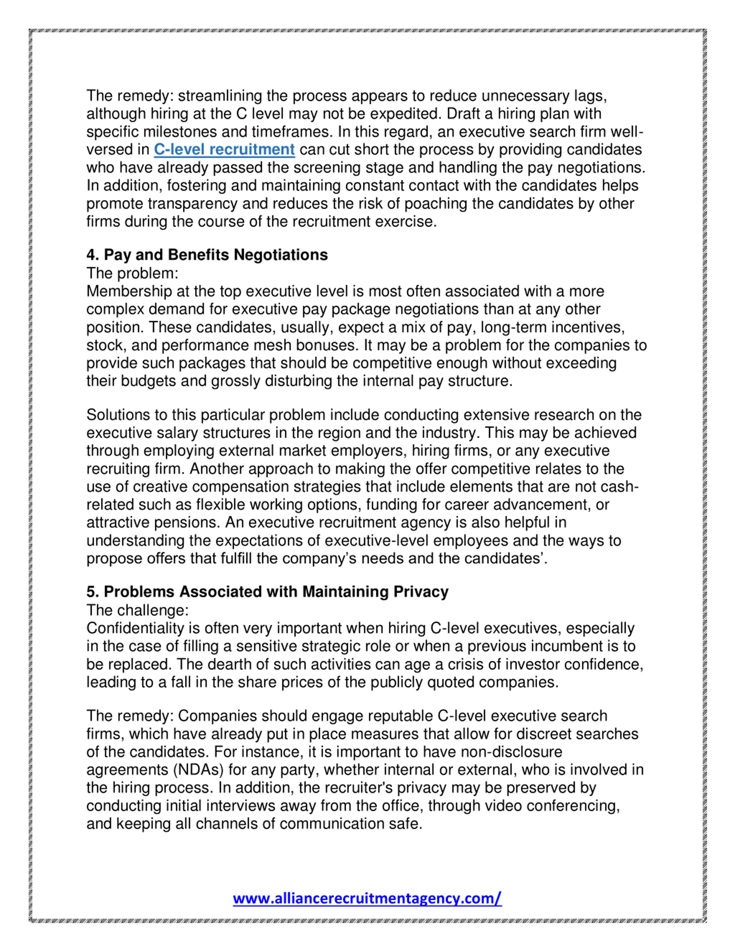The remedy: streamlining the process appears to reduce unnecessary lags, although hiring at the C level may not be expedited. Draft a hiring plan with specific milestones and timeframes. In this regard, an executive search firm well- versed in C-level recruitment can cut short the process by providing candidates who have already passed the screening stage and handling the pay negotiations. In addition, fostering and maintaining constant contact with the candidates helps promote transparency and reduces the risk of poaching the candidates by other firms during the course of the recruitment exercise. 4. Pay and Benefits Negotiations The problem: Membership at the top executive level is most often associated with a more complex demand for executive pay package negotiations than at any other position. These candidates, usually, expect a mix of pay, long-term incentives, stock, and performance mesh bonuses. It may be a problem for the companies to provide such packages that should be competitive enough without exceeding their budgets and grossly disturbing the internal pay structure. Solutions to this particular problem include conducting extensive research on the executive salary structures in the region and the industry. This may be achieved through employing external market employers, hiring firms, or any executive recruiting firm. Another approach to making the offer competitive relates to the use of creative compensation strategies that include elements that are not cash- related such as flexible working options, funding for career advancement, or attractive pensions. An executive recruitment agency is also helpful in understanding the expectations of executive-level employees and the ways to propose offers that fulfill the company s needs and the candidates . 5. Problems Associated with Maintaining Privacy The challenge: Confidentiality is often very important when hiring C-level executives, especially in the case of filling a sensitive strategic role or when a previous incumbent is to be replaced. The dearth of such activities can age a crisis of investor confidence, leading to a fall in the share prices of the publicly quoted companies. The remedy: Companies should engage reputable C-level executive search firms, which have already put in place measures that allow for discreet searches of the candidates. For instance, it is important to have non-disclosure agreements (NDAs) for any party, whether internal or external, who is involved in the hiring process. In addition, the recruiter's privacy may be preserved by conducting initial interviews away from the office, through video conferencing, and keeping all channels of communication safe. www.alliancerecruitmentagency.com/