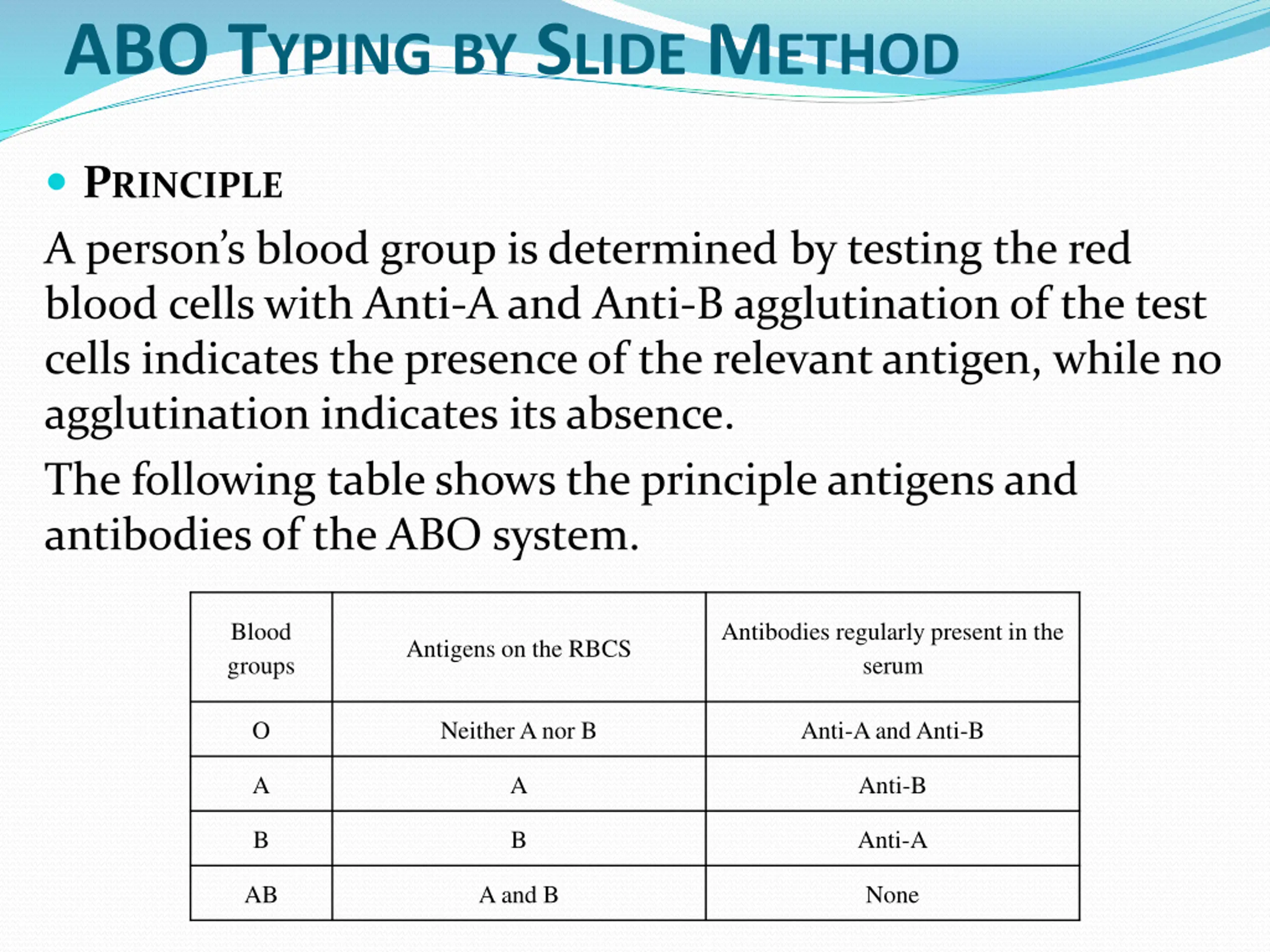 ABO TYPING BY SLIDE METHOD PRINCIPLE A person s blood group is determined by testing the red blood cells with Anti-A and Anti-B agglutination of the test cells indicates the presence of the relevant antigen, while no agglutination indicates its absence. The following table shows the principle antigens and antibodies of the ABO system. Blood groups Antibodies regularly present in the serum Antigens on the RBCS O Neither A nor B Anti-A and Anti-B A A Anti-B B B Anti-A AB A and B None