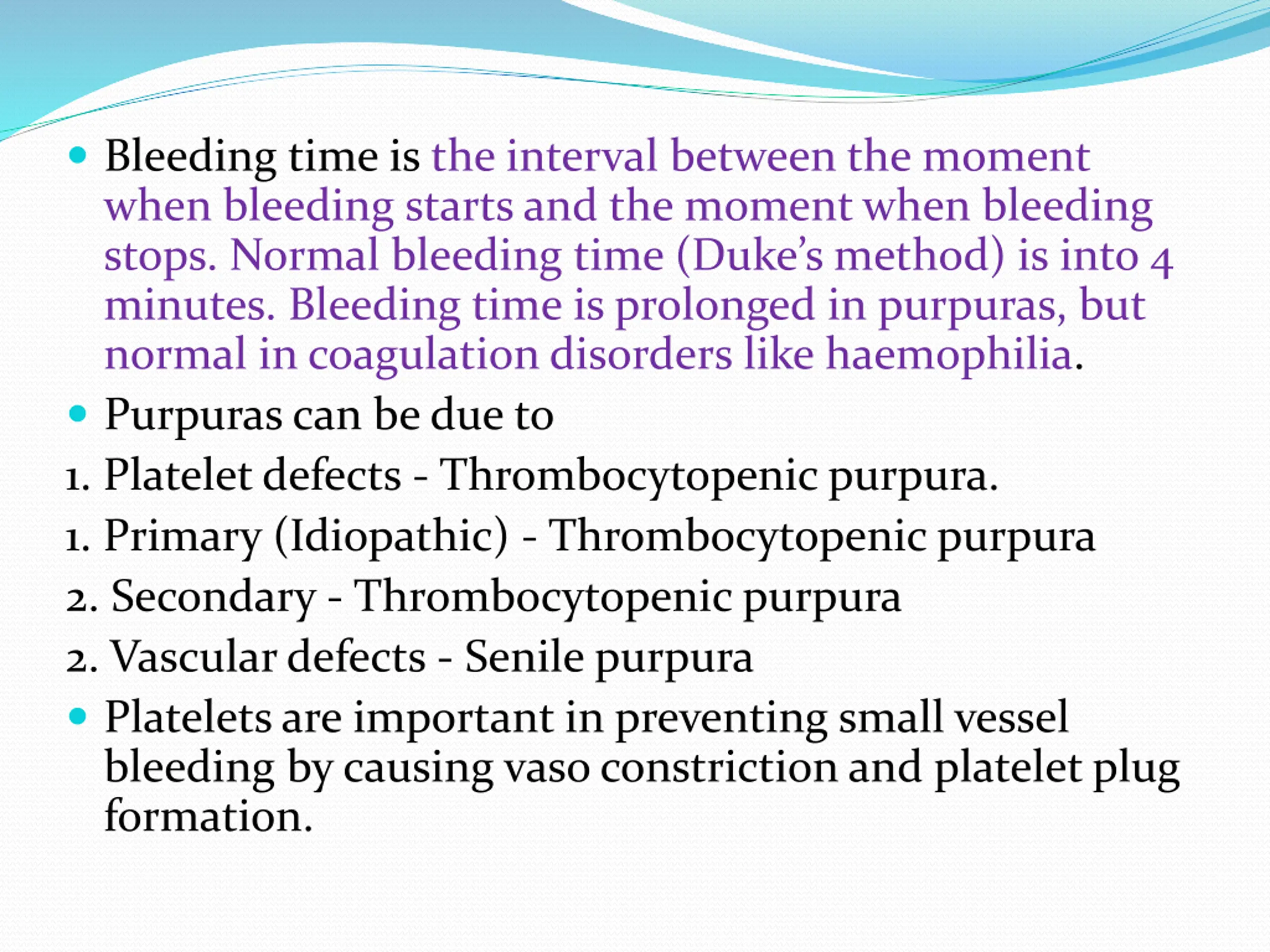 Bleeding time is the interval between the moment when bleeding starts and the moment when bleeding stops. Normal bleeding time (Duke s method) is into 4 minutes. Bleeding time is prolonged in purpuras, but normal in coagulation disorders like haemophilia. Purpurascan be due to 1. Platelet defects - Thrombocytopenic purpura. 1. Primary (Idiopathic) - Thrombocytopenic purpura 2. Secondary - Thrombocytopenic purpura 2. Vascular defects - Senile purpura Platelets are important in preventing small vessel bleeding by causing vasoconstriction and platelet plug formation.