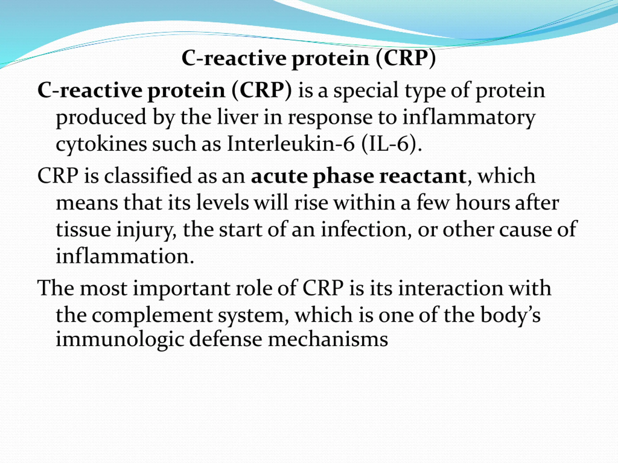 C-reactive protein (CRP) C-reactive protein (CRP) is a special type of protein produced by the liver in response to inflammatory cytokines such as Interleukin-6 (IL-6). CRP is classified as an acute phase reactant, which means that its levels will rise within a few hours after tissue injury, the start of an infection, or other cause of inflammation. The most important role of CRP is its interaction with the complement system, which is one of the body s immunologic defense mechanisms