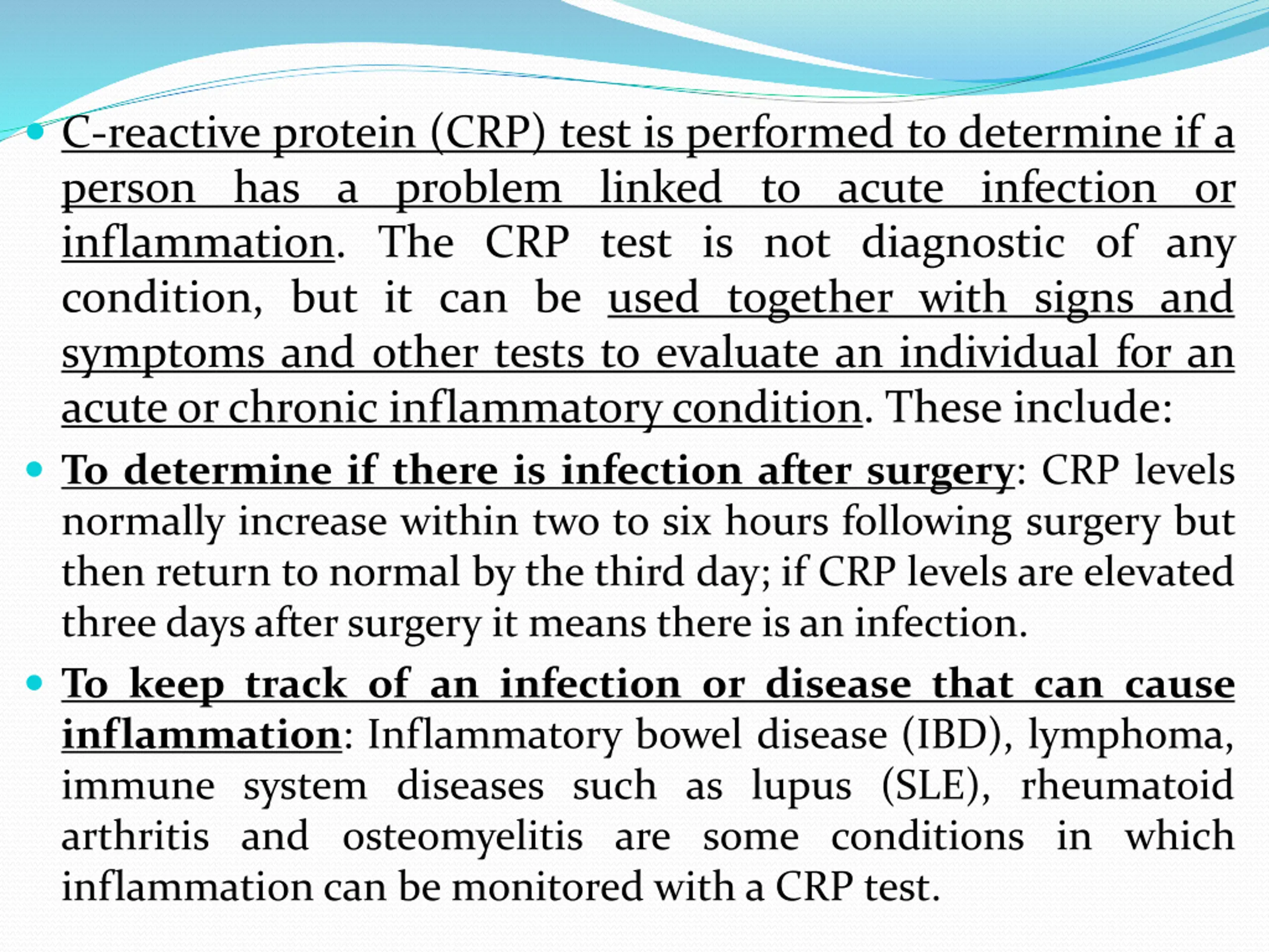 C-reactive protein (CRP) test is performed to determine if a person has a problem linked to acute infection or inflammation. The CRP test is not diagnostic of any condition, but it can be used together with signs and symptoms and other tests to evaluate an individual for an acuteorchronic inflammatorycondition. These include: To determine if there is infection after surgery: CRP levels normally increase within two to six hours following surgery but then return to normal by the third day; if CRP levels are elevated three days aftersurgery it means there is an infection. To keep track of an infection or disease that can cause inflammation: Inflammatory bowel disease (IBD), lymphoma, immune system diseases such as lupus (SLE), rheumatoid arthritis and osteomyelitis are some conditions in which inflammation can be monitored with a CRP test.