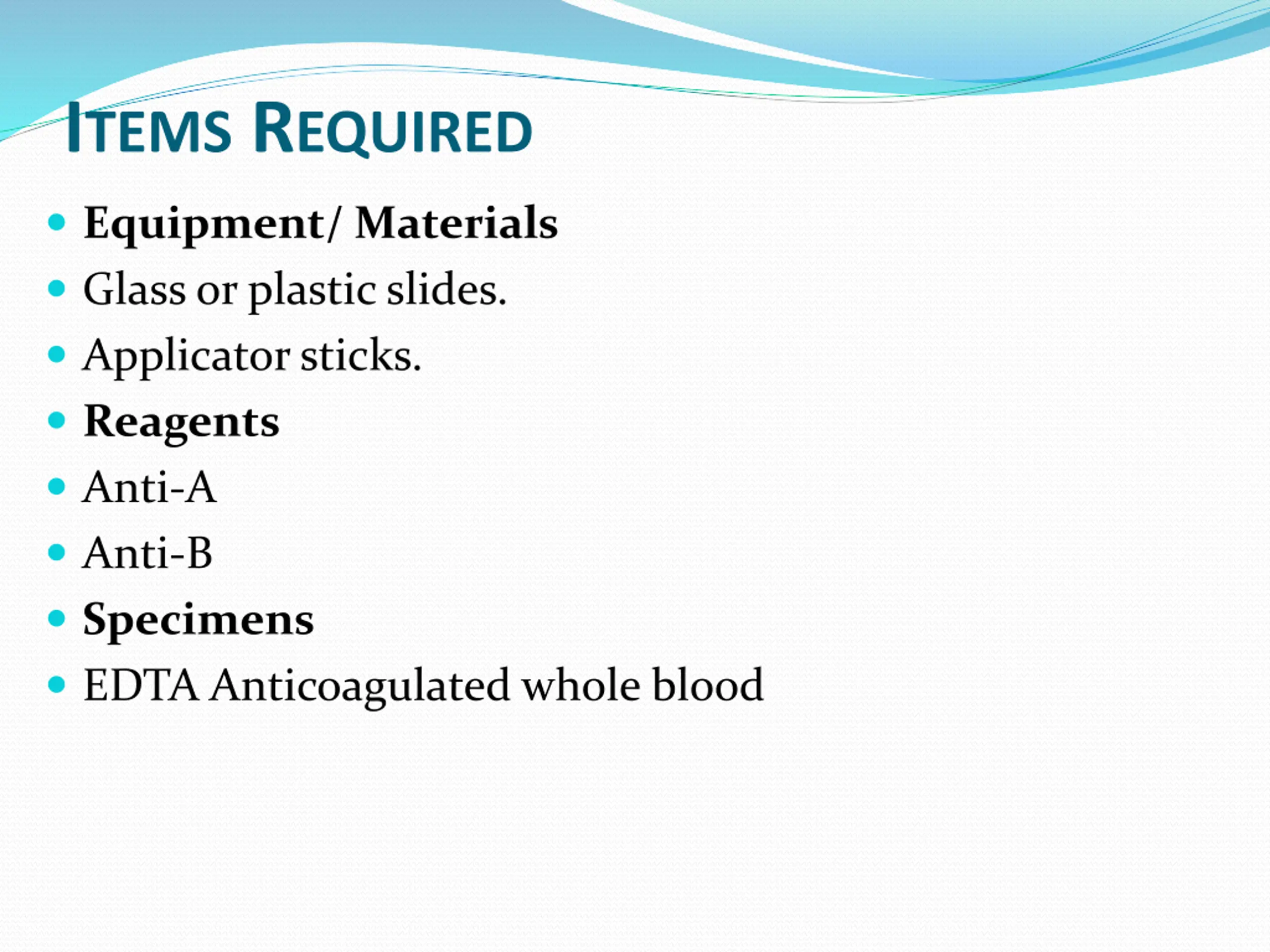 ITEMS REQUIRED Equipment/ Materials Glass or plastic slides. Applicator sticks. Reagents Anti-A Anti-B Specimens EDTA Anticoagulated whole blood