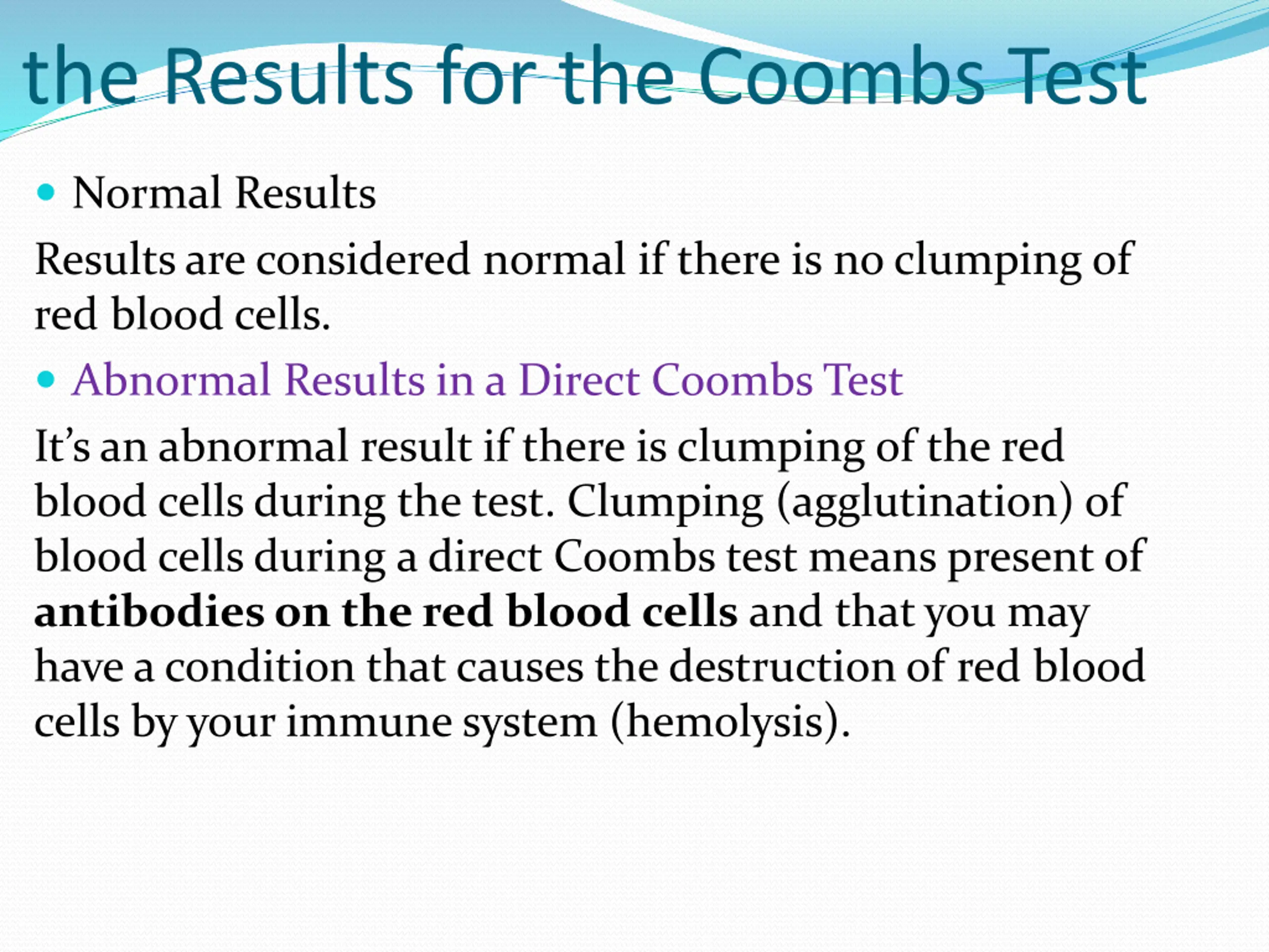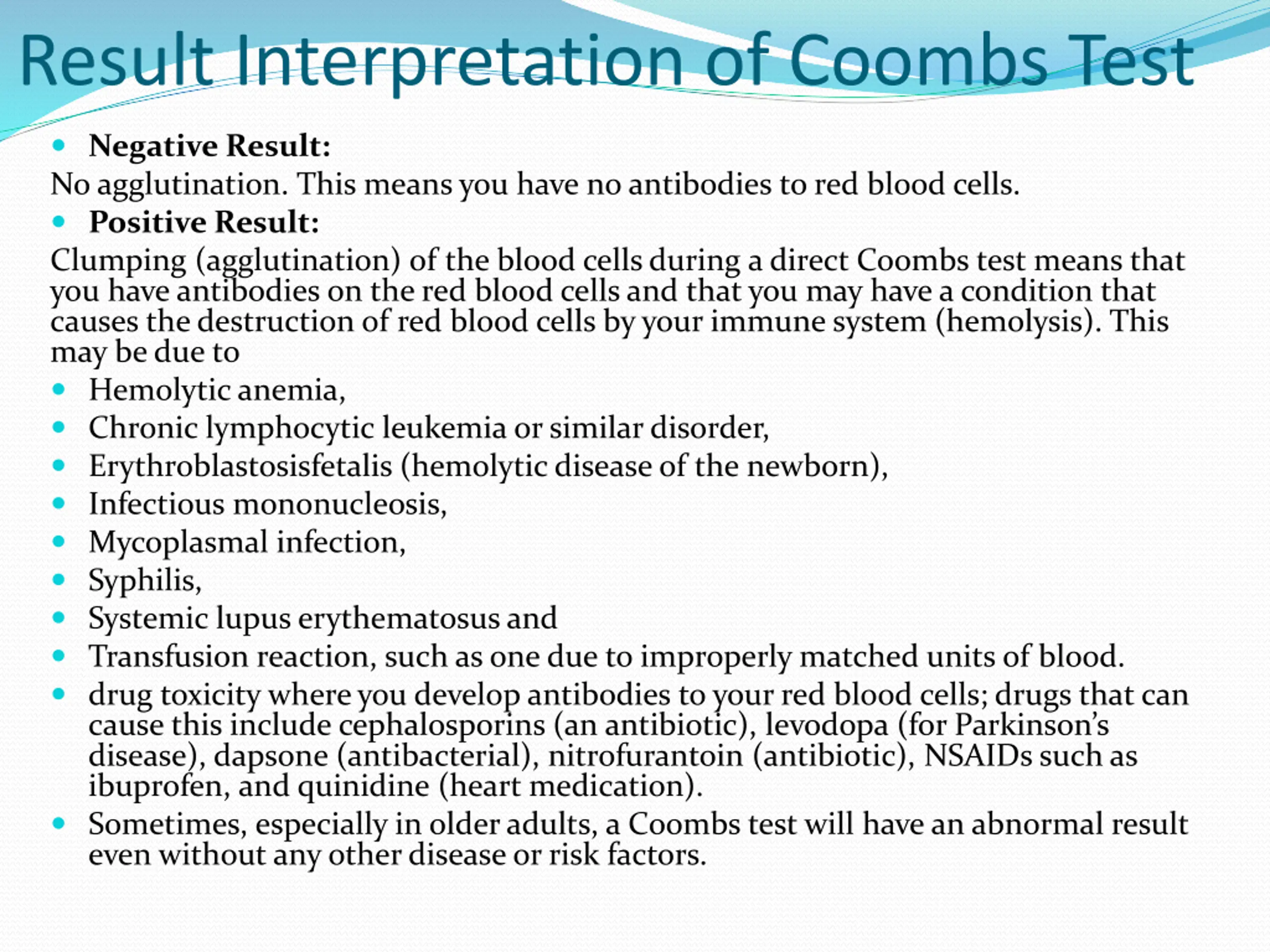 Result Interpretation of Coombs Test Negative Result: No agglutination. This means you have no antibodies to red blood cells. Positive Result: Clumping (agglutination) of the blood cells during a direct Coombs test means that you have antibodies on the red blood cells and that you may have a condition that causes the destruction of red blood cells by your immune system (hemolysis). This may be due to Hemolytic anemia, Chronic lymphocytic leukemia or similar disorder, Erythroblastosisfetalis (hemolytic disease of the newborn), Infectious mononucleosis, Mycoplasmal infection, Syphilis, Systemic lupus erythematosusand Transfusion reaction, such as one due to improperly matched units of blood. drug toxicity where you develop antibodies to your red blood cells; drugs that can cause this include cephalosporins (an antibiotic), levodopa (for Parkinson s disease), dapsone (antibacterial), nitrofurantoin (antibiotic), NSAIDs such as ibuprofen, and quinidine (heart medication). Sometimes, especially in older adults, a Coombs test will have an abnormal result even without any other disease or risk factors.