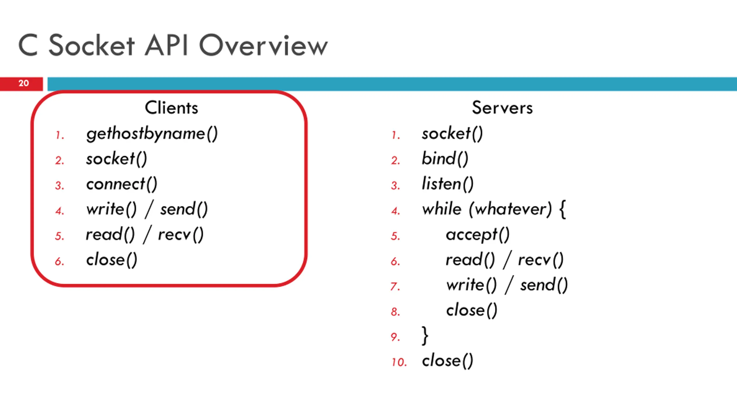C Socket API Overview 20 Clients Servers gethostbyname() socket() connect() write() / send() read() / recv() close() socket() bind() listen() while (whatever) { accept() read() / recv() write() / send() close() } 10. close() 1. 1. 2. 2. 3. 3. 4. 4. 5. 5. 6. 6. 7. 8. 9.
